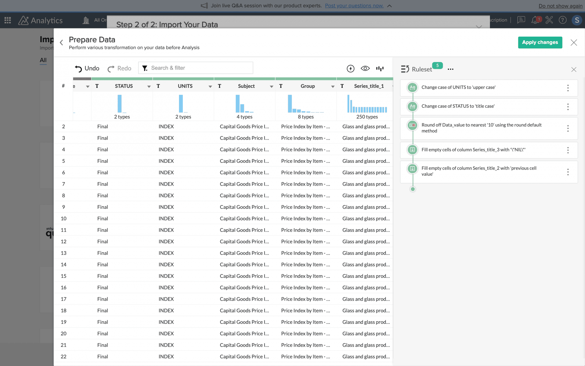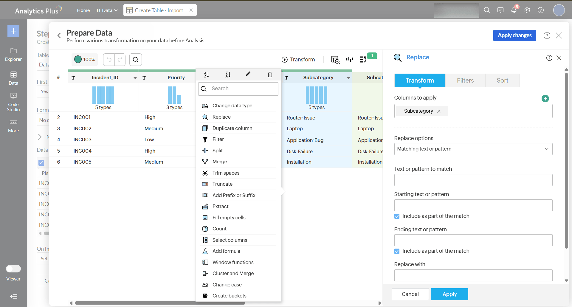 3. The Prepare Data pane will open. You can apply various transformations, such as changing number format, Find and Replace and define rule sets to enrich the data quality.