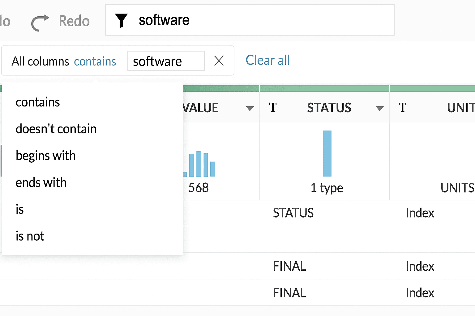 A detailed version of the histogram is present under Column details. You can search and filter the column data from this histogram. You can also edit the values present in the histogram and have it changed in the entire column as shown in the screenshot below.