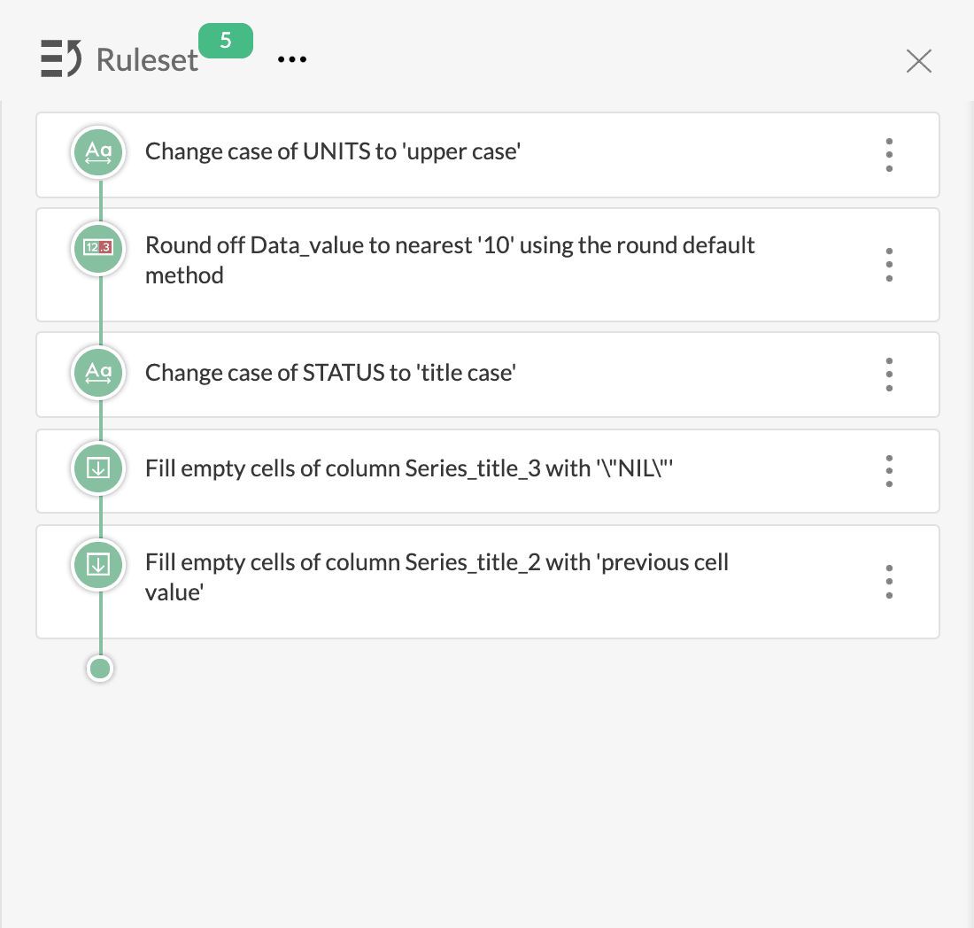 Each transformation applied on the dataset is stored as a rule, in order of their execution. The ordered list of these rules is called a Ruleset. You can access the Ruleset from the Ruleset pane, where you can add, edit, preview, or remove the rules that have been applied.