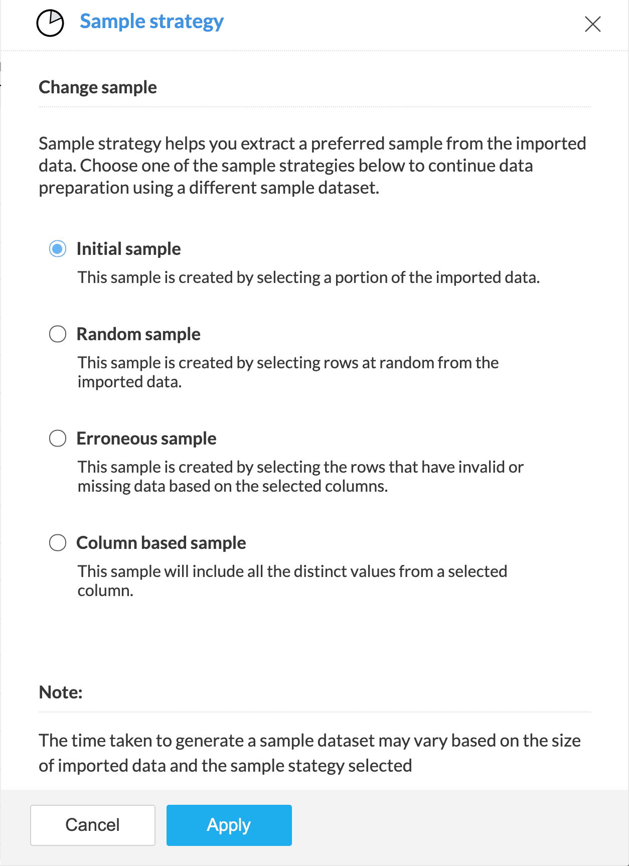 Generating sample data based on the imported data is called Sample strategy. You can choose one of the four methods to create a sample. You can also change the strategy at any point during the data prep process. Click on the Edit icon to change the sample strategy.