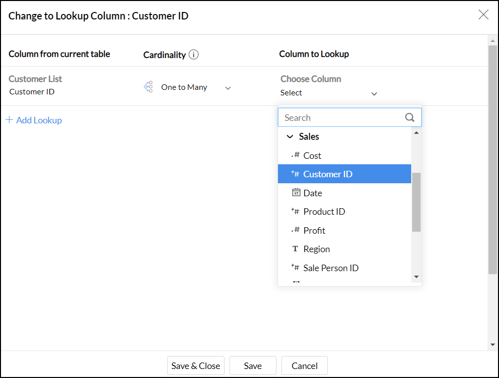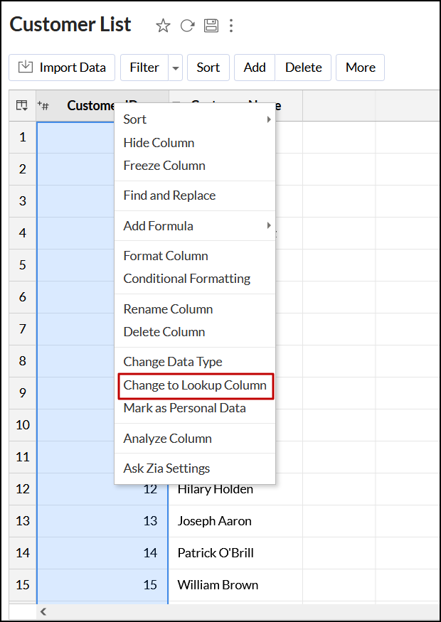 Analytics Plus allows you to change any table column to a lookup column. A lookup column is a type of column whose values are referenced from a column in another table in the same workspace. Click here to learn more about lookup columns. To change a column to a lookup column, follow the steps below: