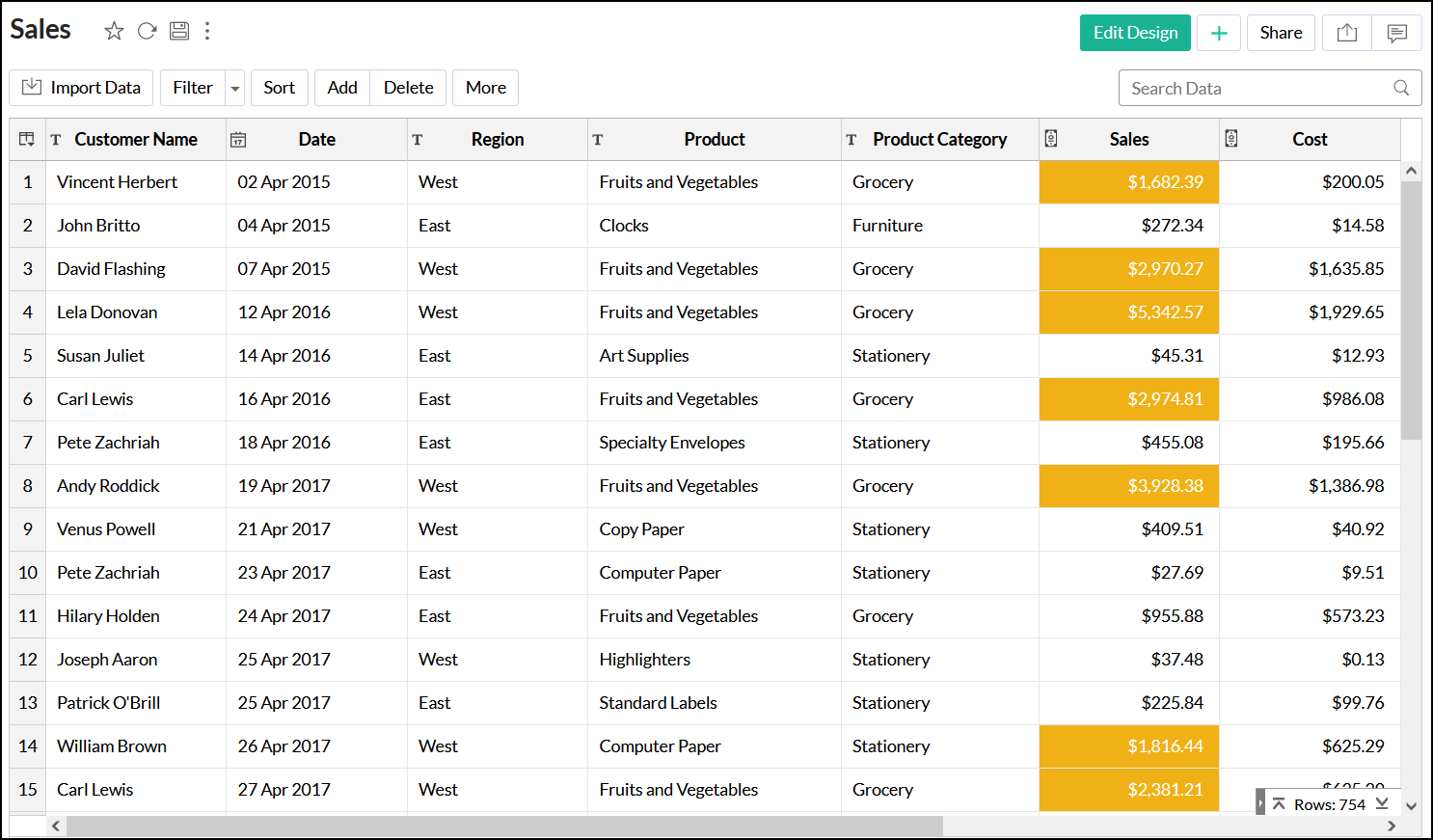 ManageEngine Analytics Plus offers a range of interactive options to work with a table. Some of the options include Filter, Sort, Format, Find and Replace values, Freeze, and Show/Hide Columns. ManageEngine Analytics Plus also allows to Export, Share and Publish a table.