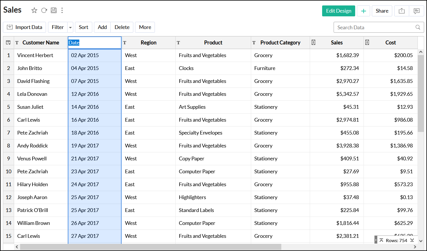 The Freeze Column option allows you to keep specific columns always visible in the table even when you scroll horizontally across the screen. For example, you can freeze columns that identify the records (Ex:- Customer Name, Product ID) in a table so that you can keep track of a record that you are looking for, even when you scroll off to the right-most column in the table.