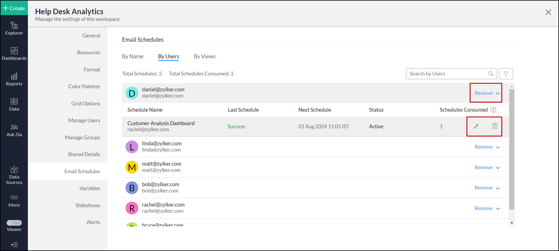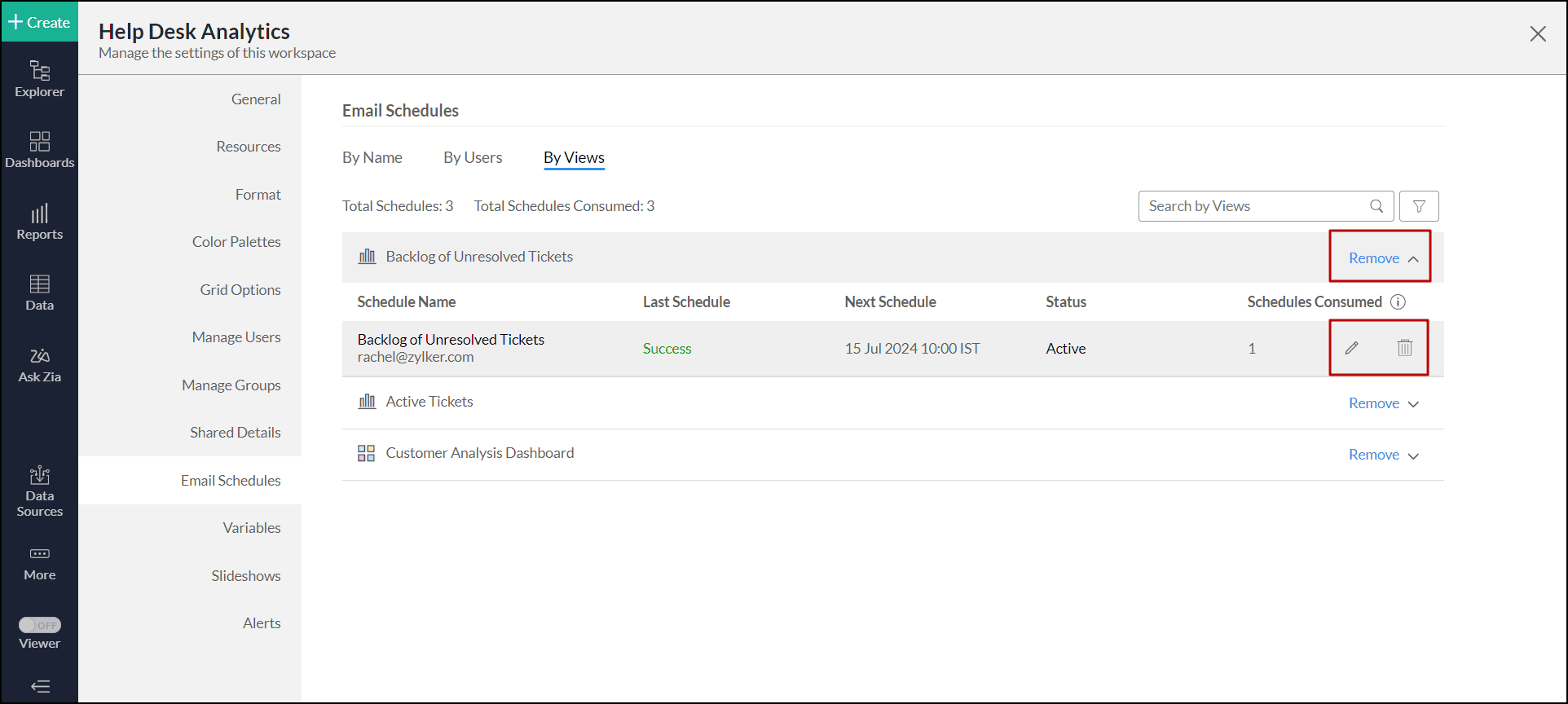 Analytics Plus allows you to efficiently manage all the email schedules within your workspace. To do this, click Workspace Settings from the side pane, and navigate to the Email Schedule tab. The email schedules are organized into three distinct groupings to streamline the management process as follows: