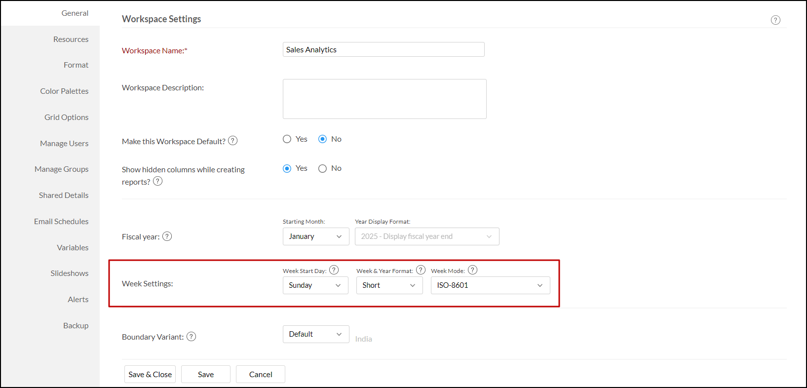 • Week & Year Format: You can select the format in which the weeks are to be displayed in your workspace. The following options are available: