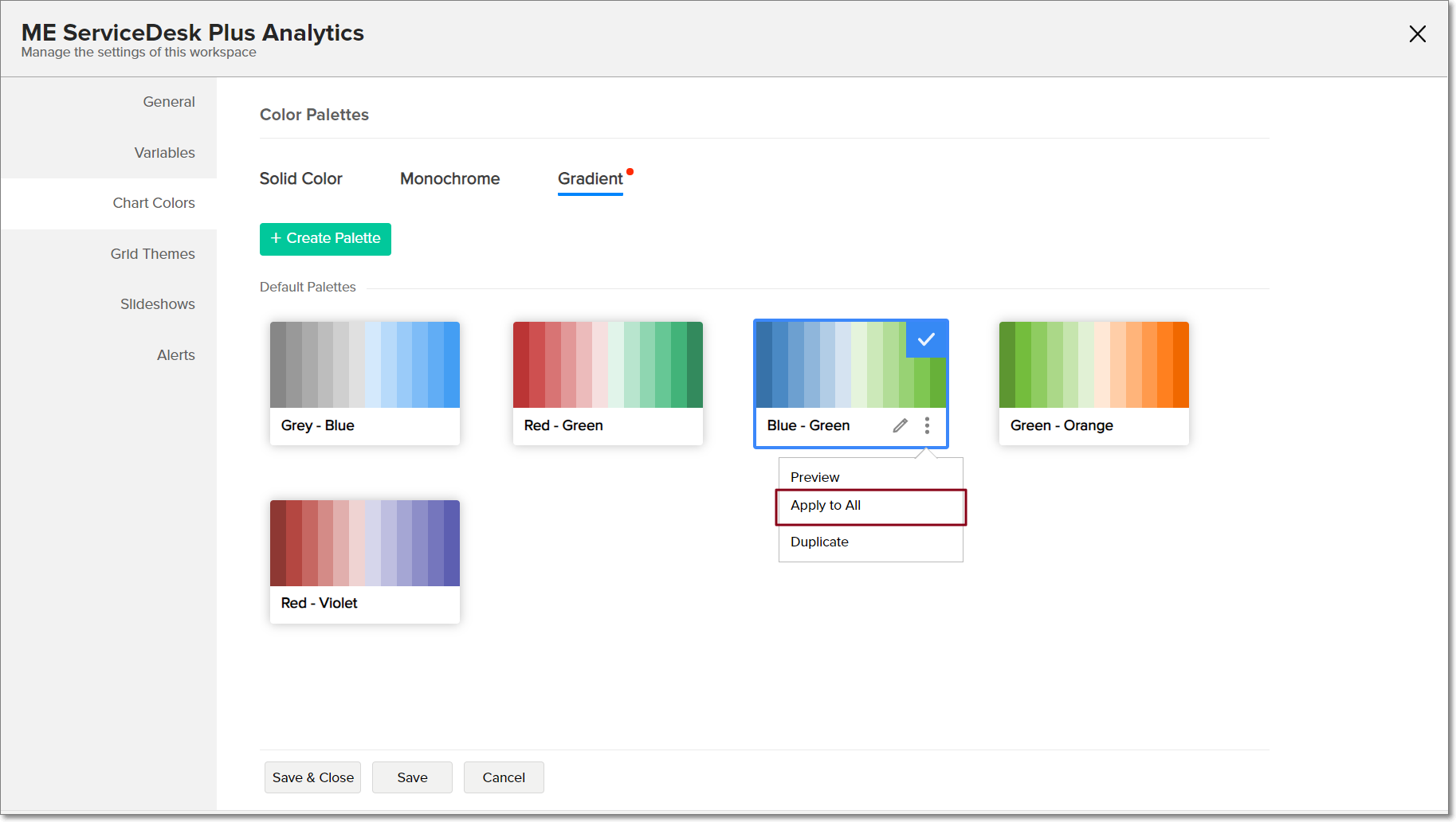 To apply the customized palette to all existing charts in your workspace, navigate to the required palette and click the More Actions icon that appears on mouse over. Select the Apply to All option, and click Save. This will apply the colors from the palette to all existing charts in the workspace. This is an irreversible action.
