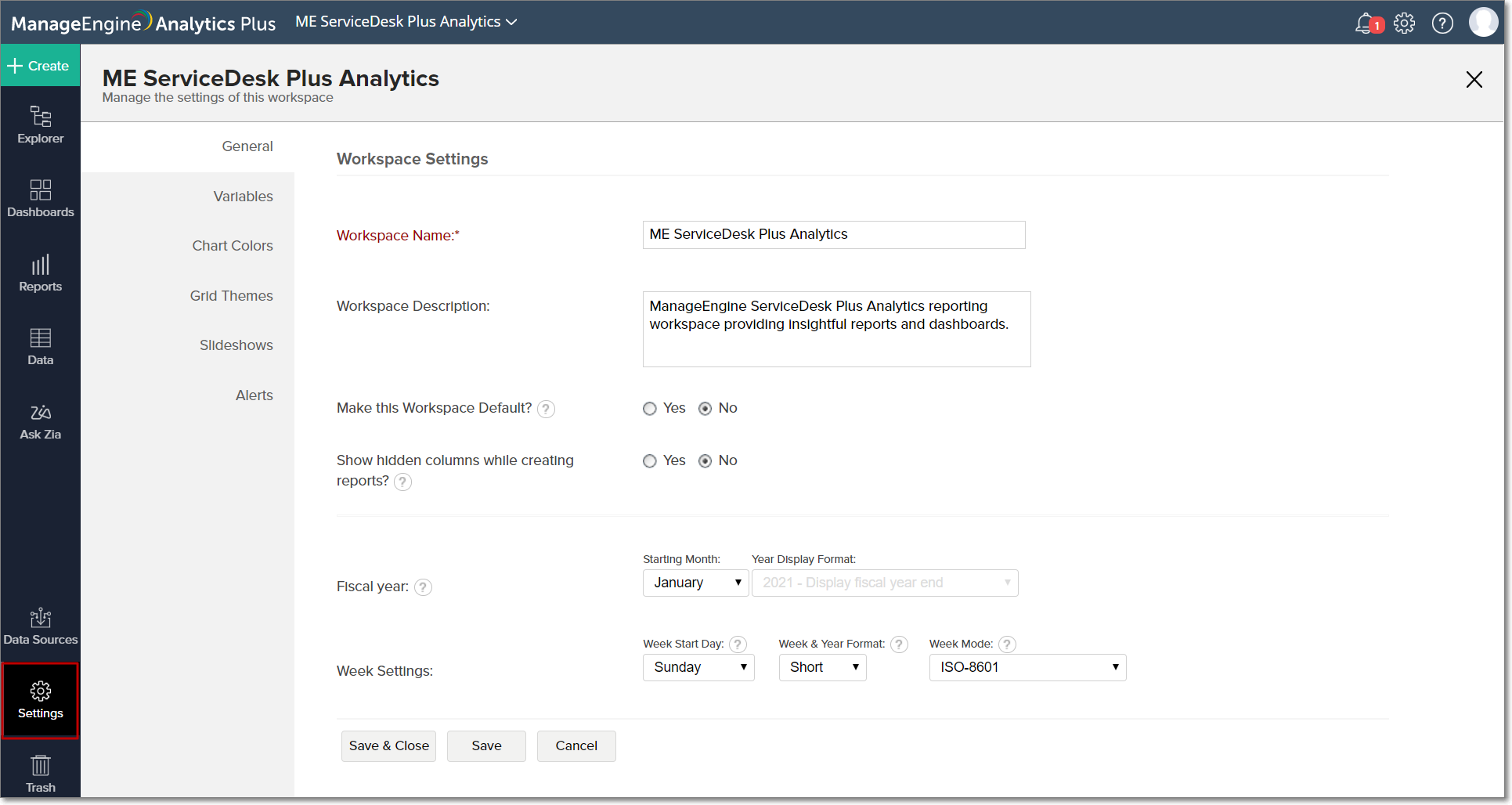 Setting a default workspace ensures that the workspace will be opened automatically on every login. To set a default workspace, click the Settings button from the left panel, and navigate to the General tab. Select the Yes radial button under the Make this Workspace Default? option, and click Save. You can also set a workspace as default from the Analytics Plus homepage. Click here to learn more.