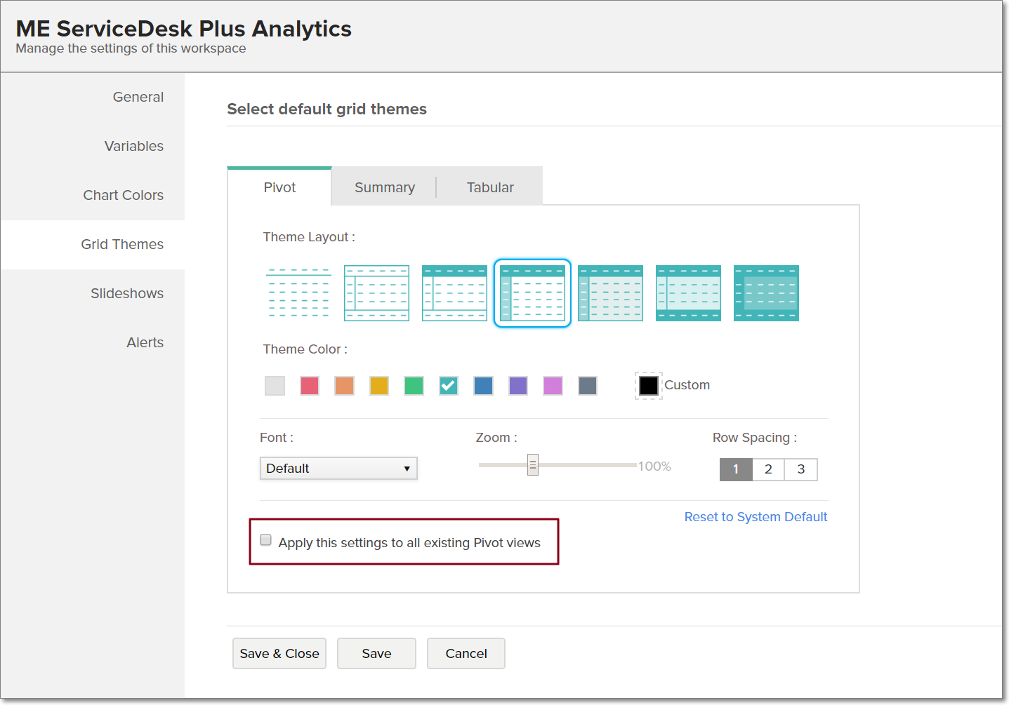 To apply the modified grid theme to the existing pivot, summary or tabular views in your workspace, select the Apply this setting to all existing views checkbox in the Grid Theme section of the workspace settings page.