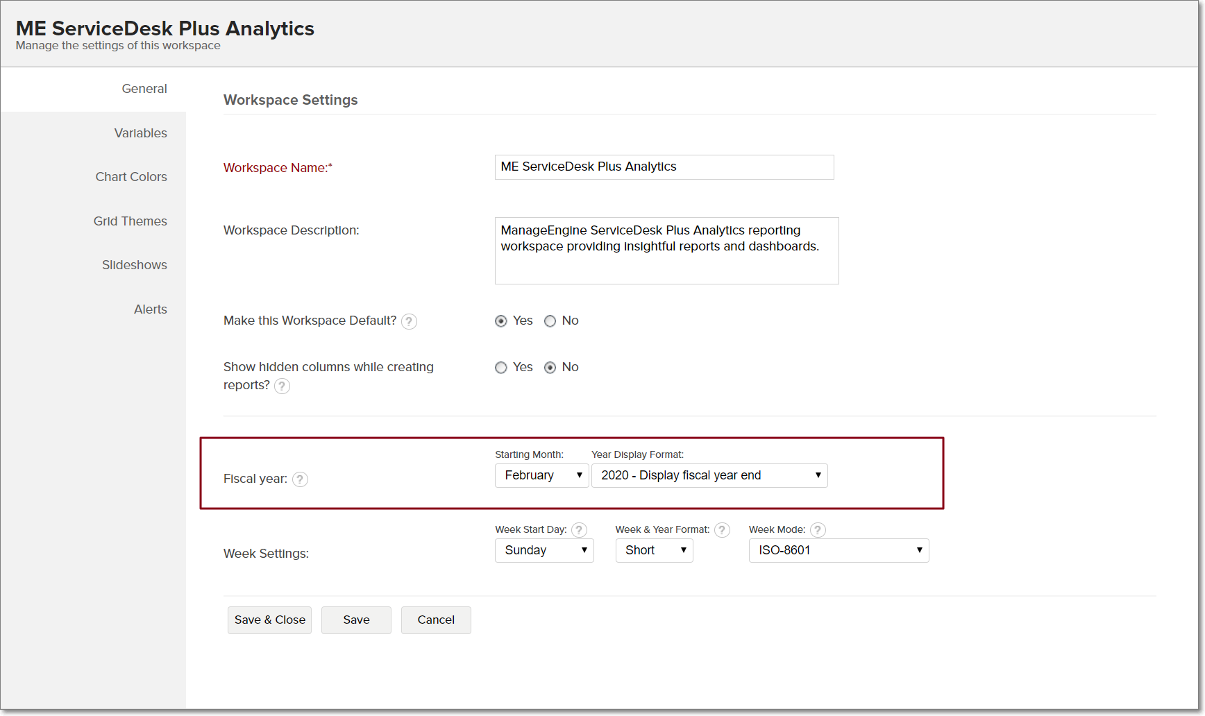 Analytics Plus provides several options to customize your workspaces, such as setting the beginning of your fiscal year, setting chart color or grid theme across reports and managing users, data alerts and slideshows.