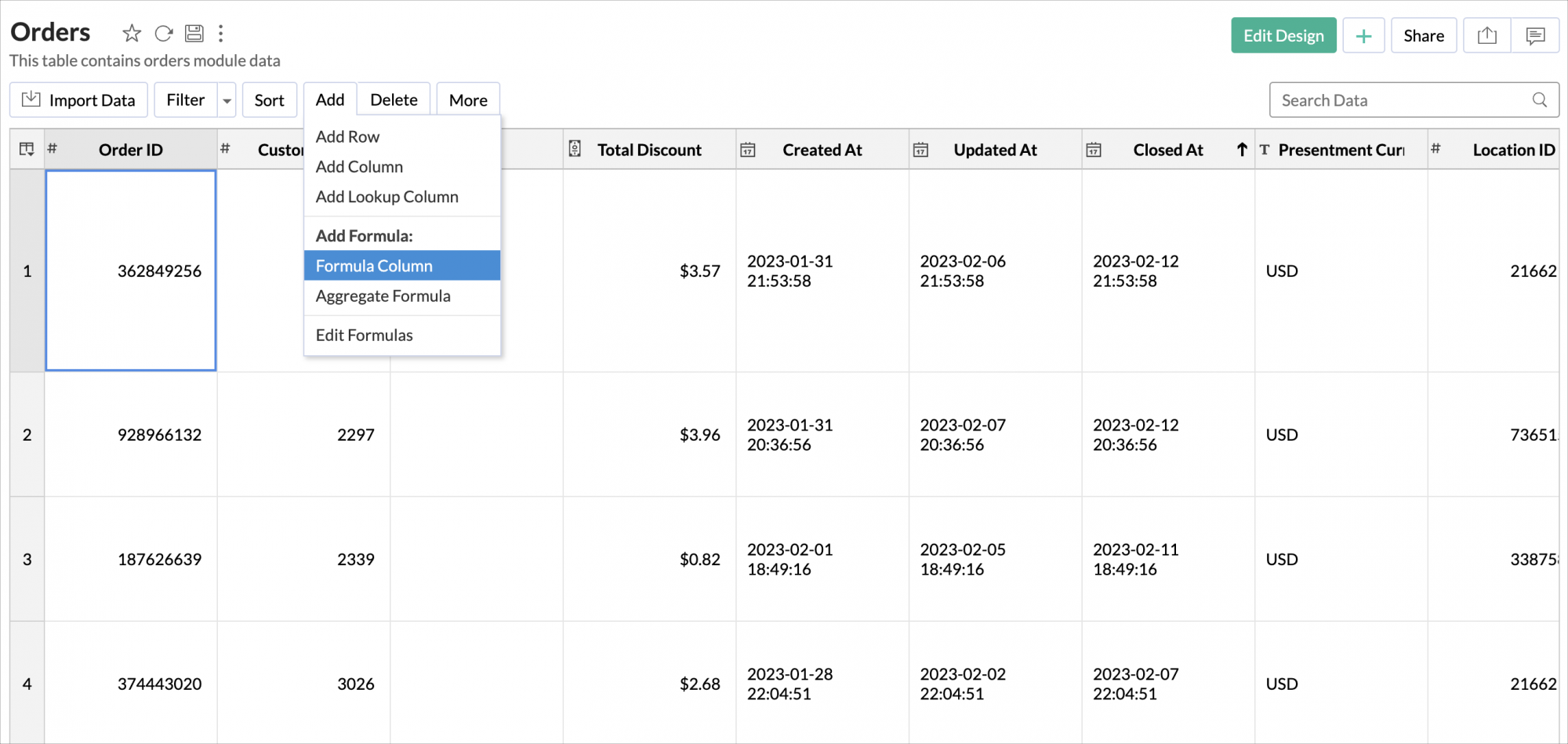 - Select the Add > Formula Column option from the toolbar or right-click on a column in the table and select the Add Formula > Formula Column.