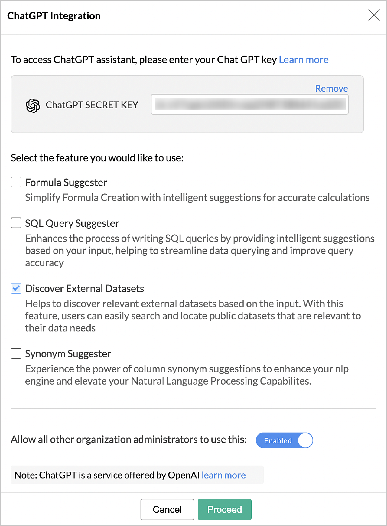 - If you haven’t enabled the ChatGPT integration, then the ChatGPT Integration wizard will open. Select the features for which you wish to enable the integration and then click Proceed.