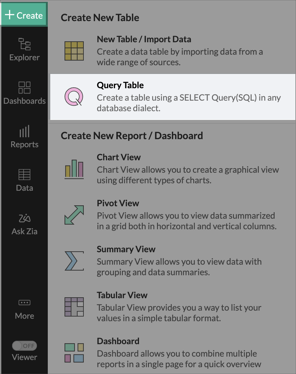 - From the Analytics Plus home page, click Import your Data or click Create from the Explorer tab and select New Table/Import Data.