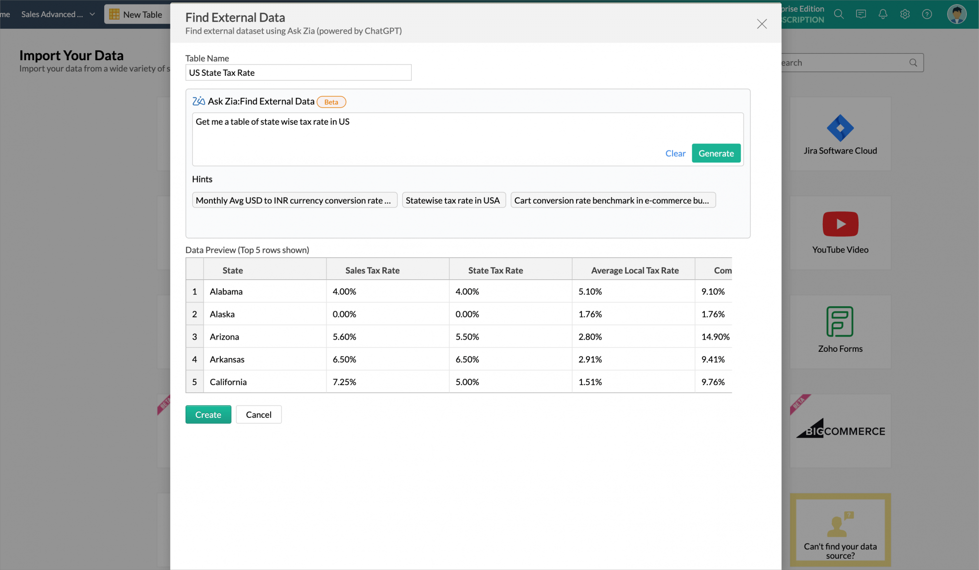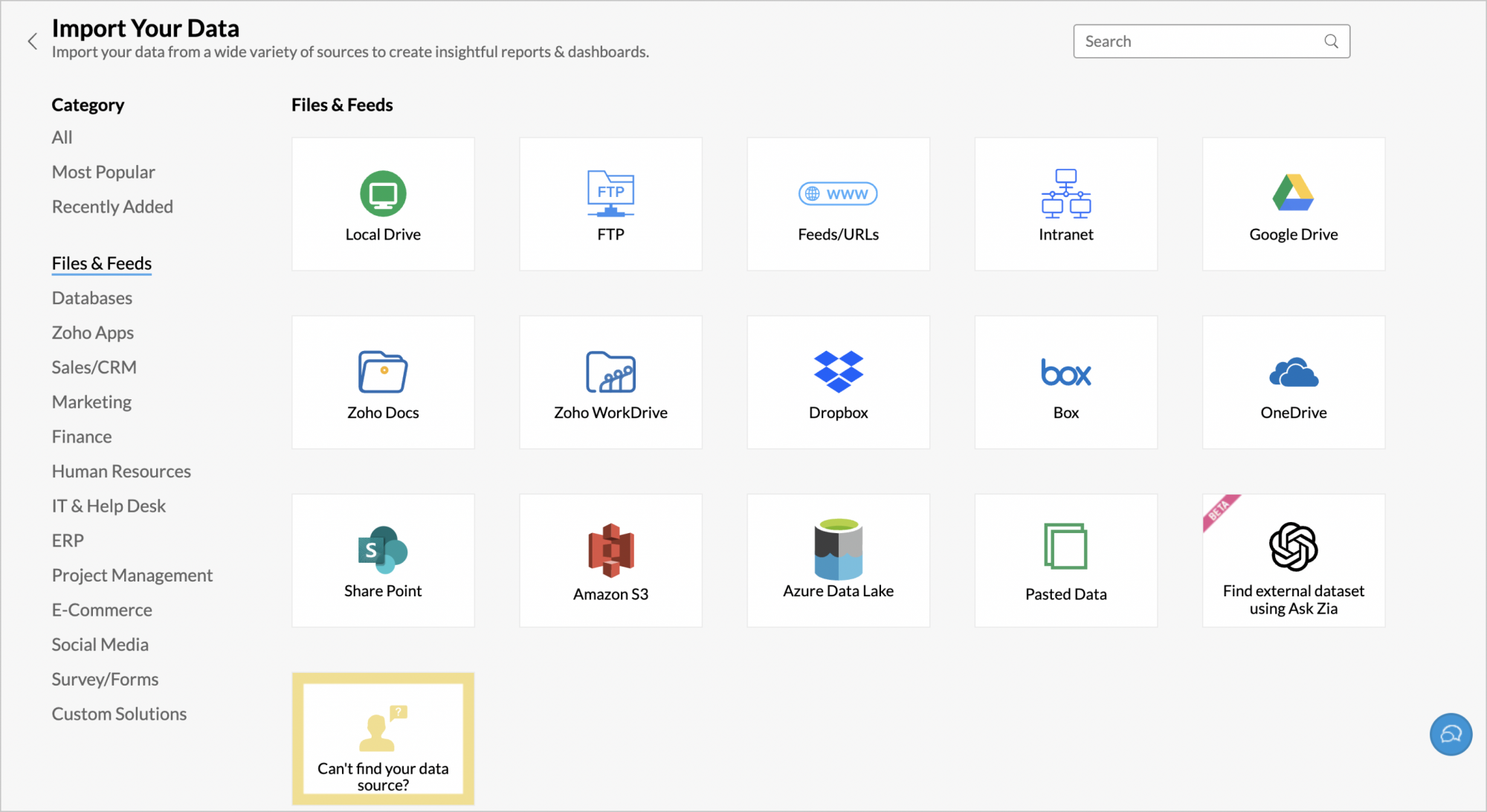 - Select Find External dataset using Ask Zia from the listed data sources.