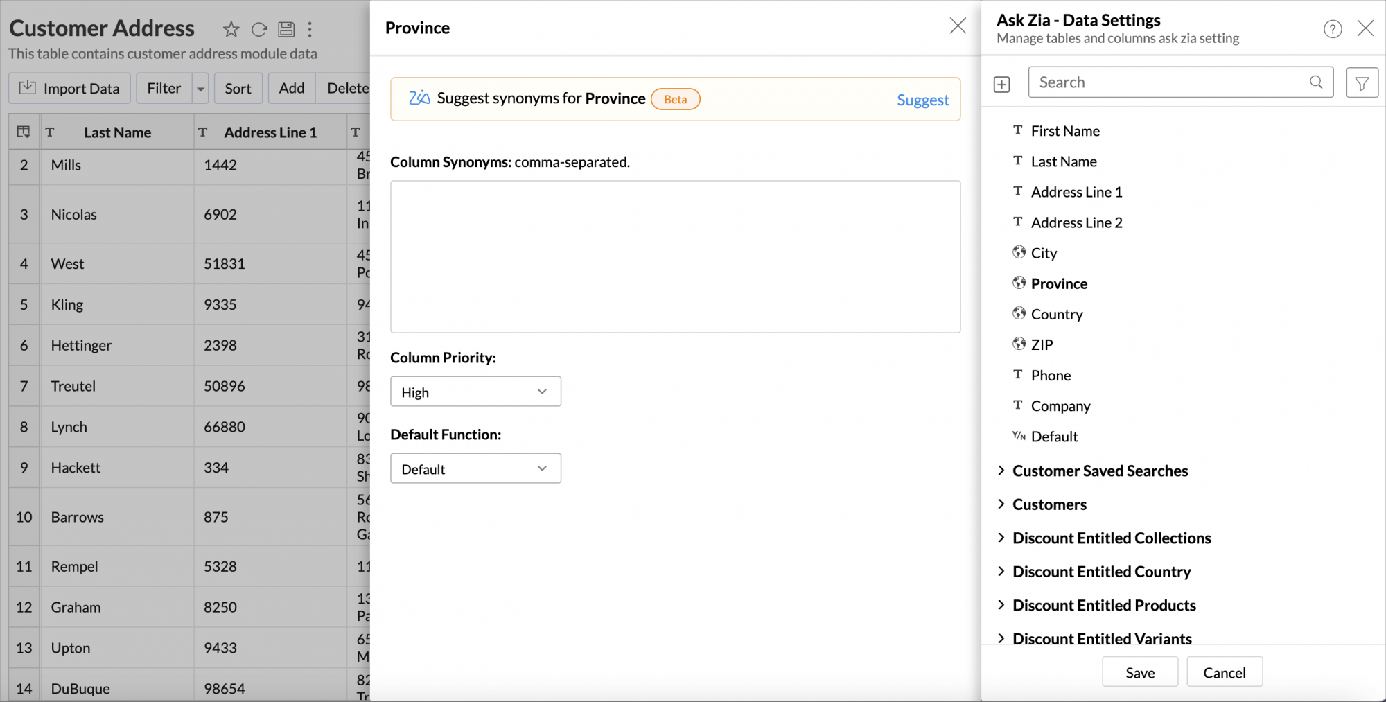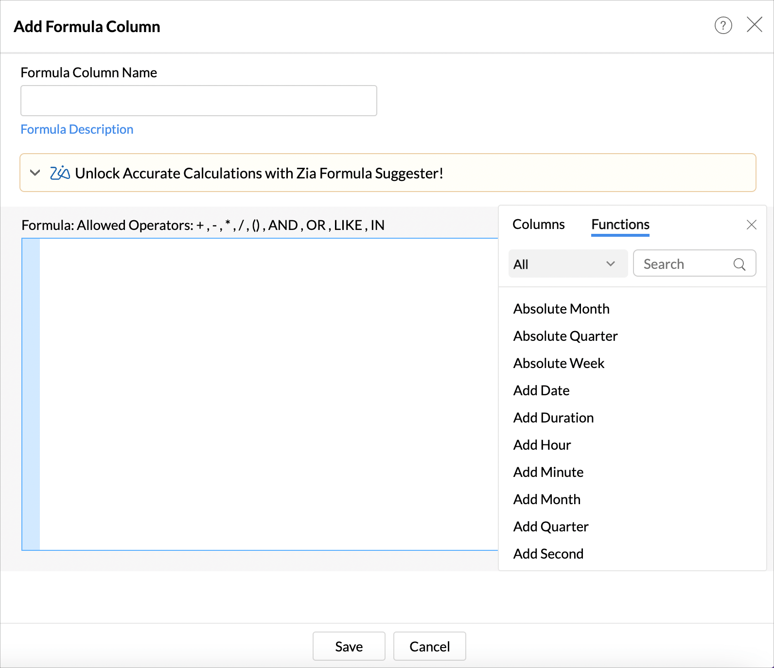 Finding the correct formula for analyzing data can be tedious and time-consuming. With the Ask Zia: Formula suggester, you can create formulas by asking questions in simple natural language and get intelligent suggestions. Follow the below steps to use formula suggester while creating formula columns.