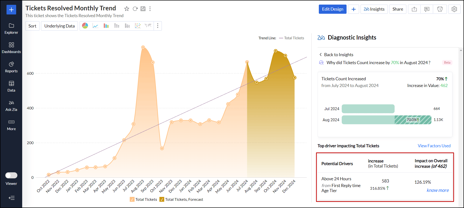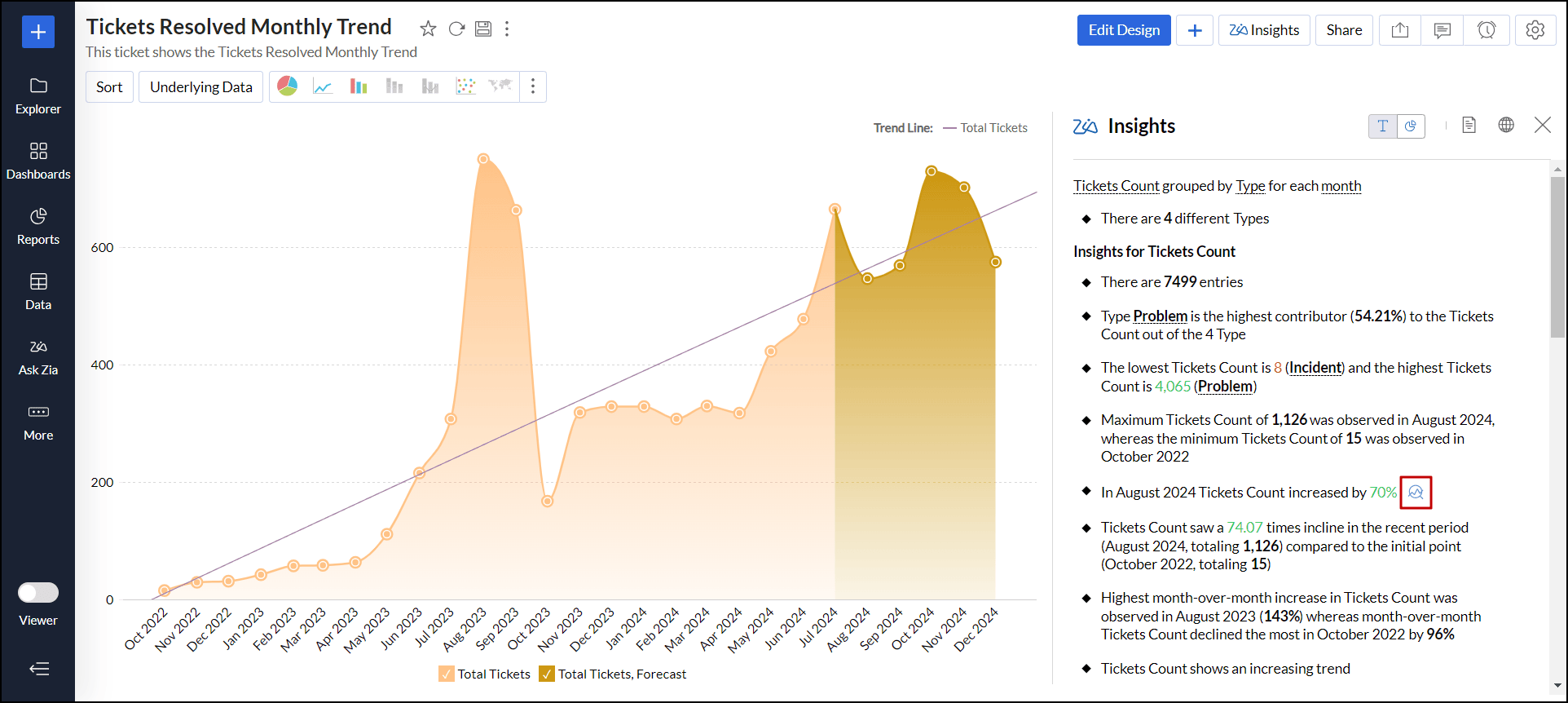 To view the diagnostic insights, click the Diagnosis icon that appears on the Time Series Insights in the Zia Insights dialog.