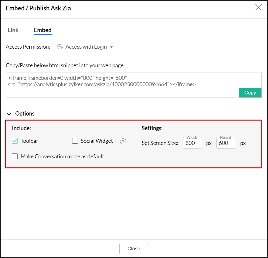 - Access with Login: Select this option to securely embed Ask Zia. Users should login to Analytics Plus and have the required tables shared with them to create reports using Ask Zia.