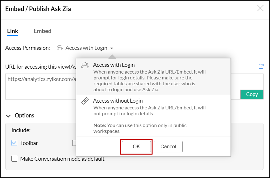- Access with Login: Select this option to securely publish Ask Zia. Users should login to Analytics Plus and have the required tables shared with them to create reports using Ask Zia.