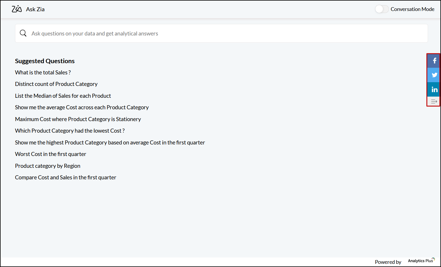 Analytics Plus paves a way to let your users gain the advantage of Ask Zia. You can either create a permalink or generate an embedded link, and share it with the users to access Ask Zia and generate their own reports.