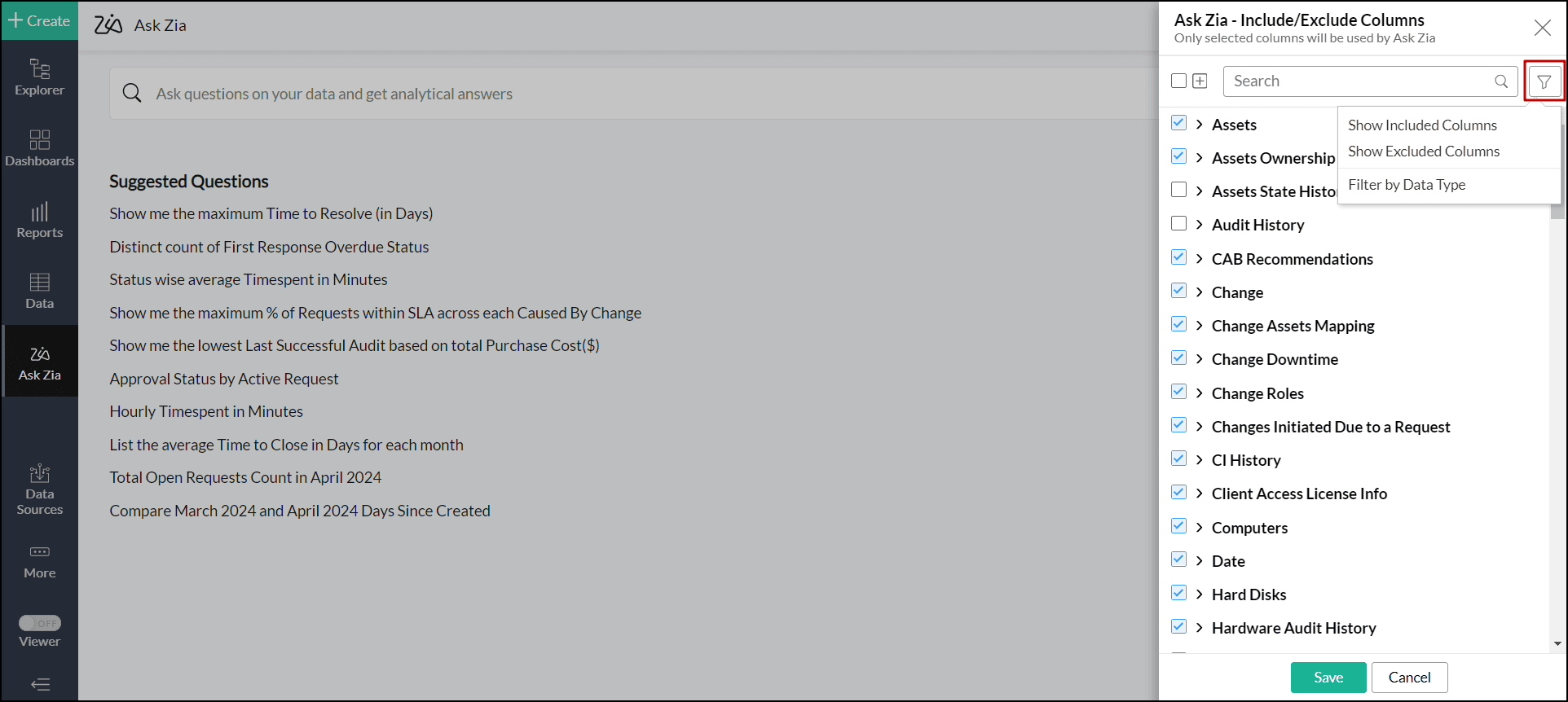 Note: Excluded columns will not be used for Zia Suggestions and Zia Insights, as Zia will not create reports using the excluded columns.