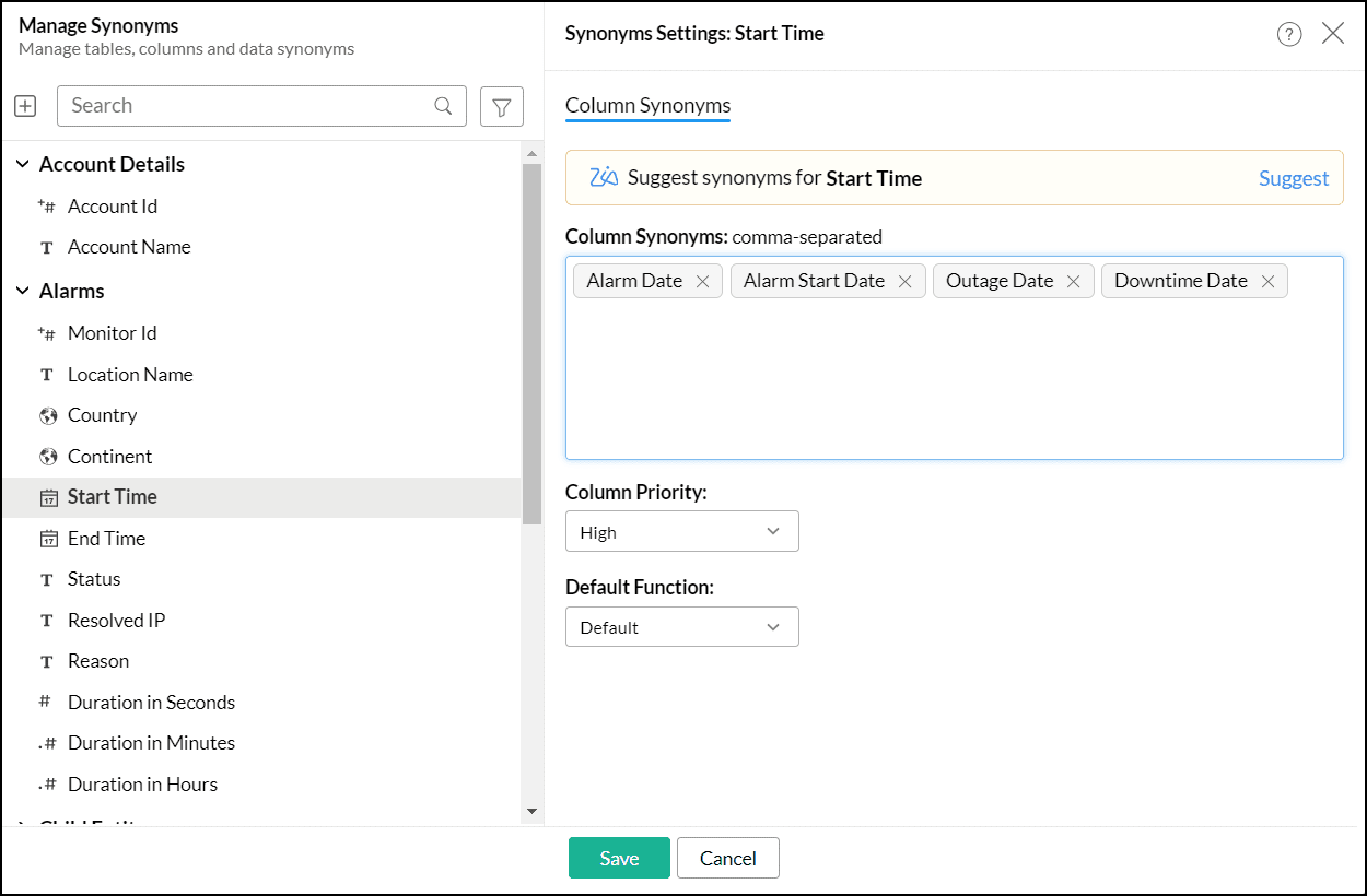 Column Synonyms allow you to specify other terms that refer to the column name. Select the column to open the settings. Enter the Column Synonyms as comma-separated values.
