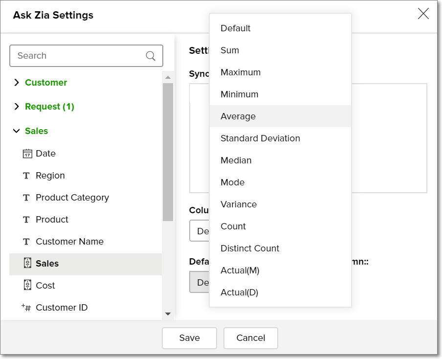 Analytics Plus provides a wide range of functions for each data type. When you use a column in your question, Ask Zia will try to apply the best possible function over your column. You can also set the Default Function to be applied over the columns when it is called in the query.