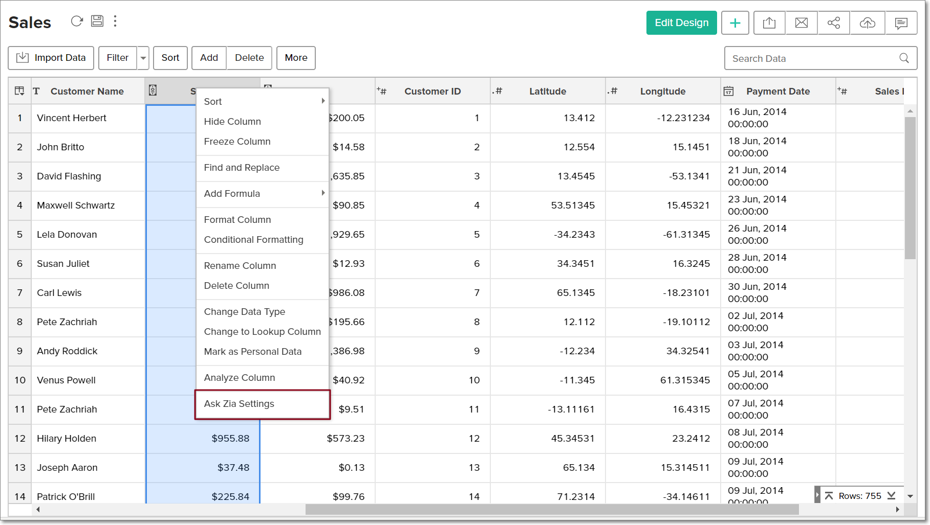 • Using Column settings: You can also right-click a column and select the Ask Zia Settings option to access the settings page.