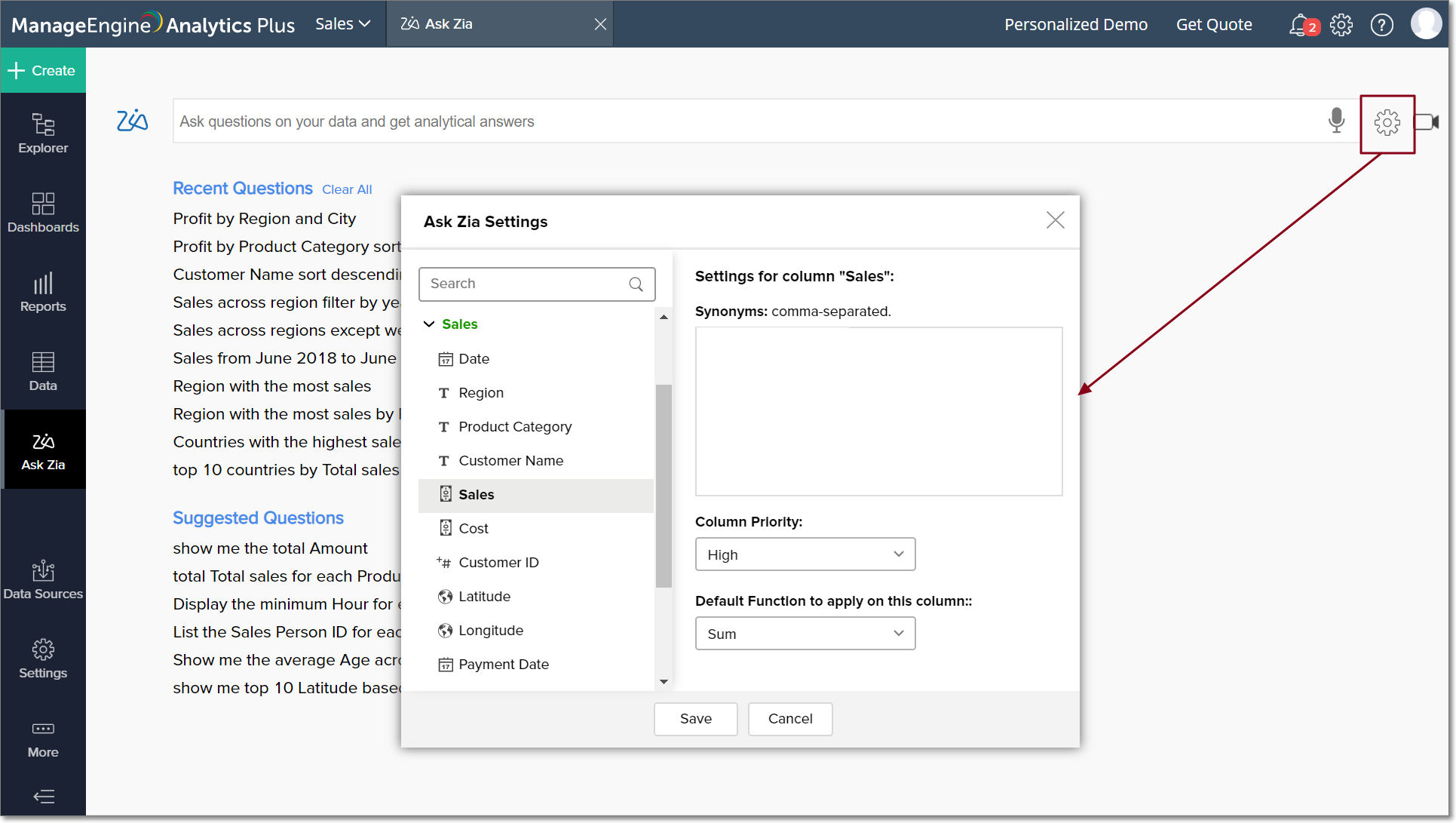 You can customize Ask Zia to fit your exact requirements, using Synonyms, Column Priority and Default Functions.