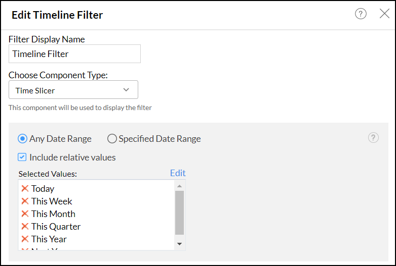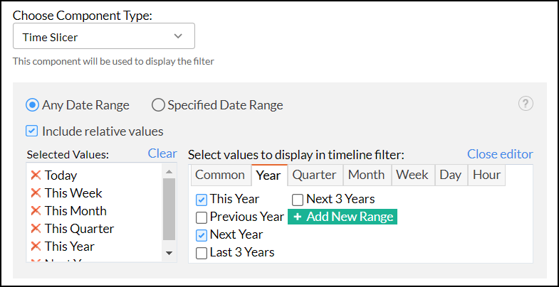 - Enable the Include relative values checkbox to add relative values to the time slicer filter. On enabling, the following values are added by default: Today, This Week, This Month, This Quarter, This Year, and Next Year.