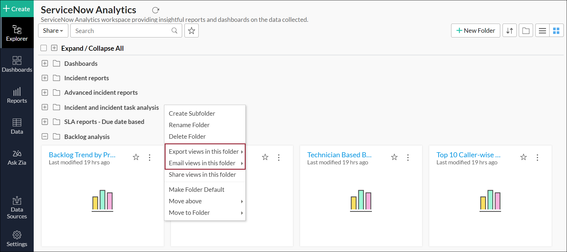 Yes. To do this, navigate to the Explorer view, and click the Actions icon that appears on mouse over the required folder. Select the Export views in this folder option, and choose the required format to export the views in the folder. The Email views in this folder allows you to email the views in the selected folder.