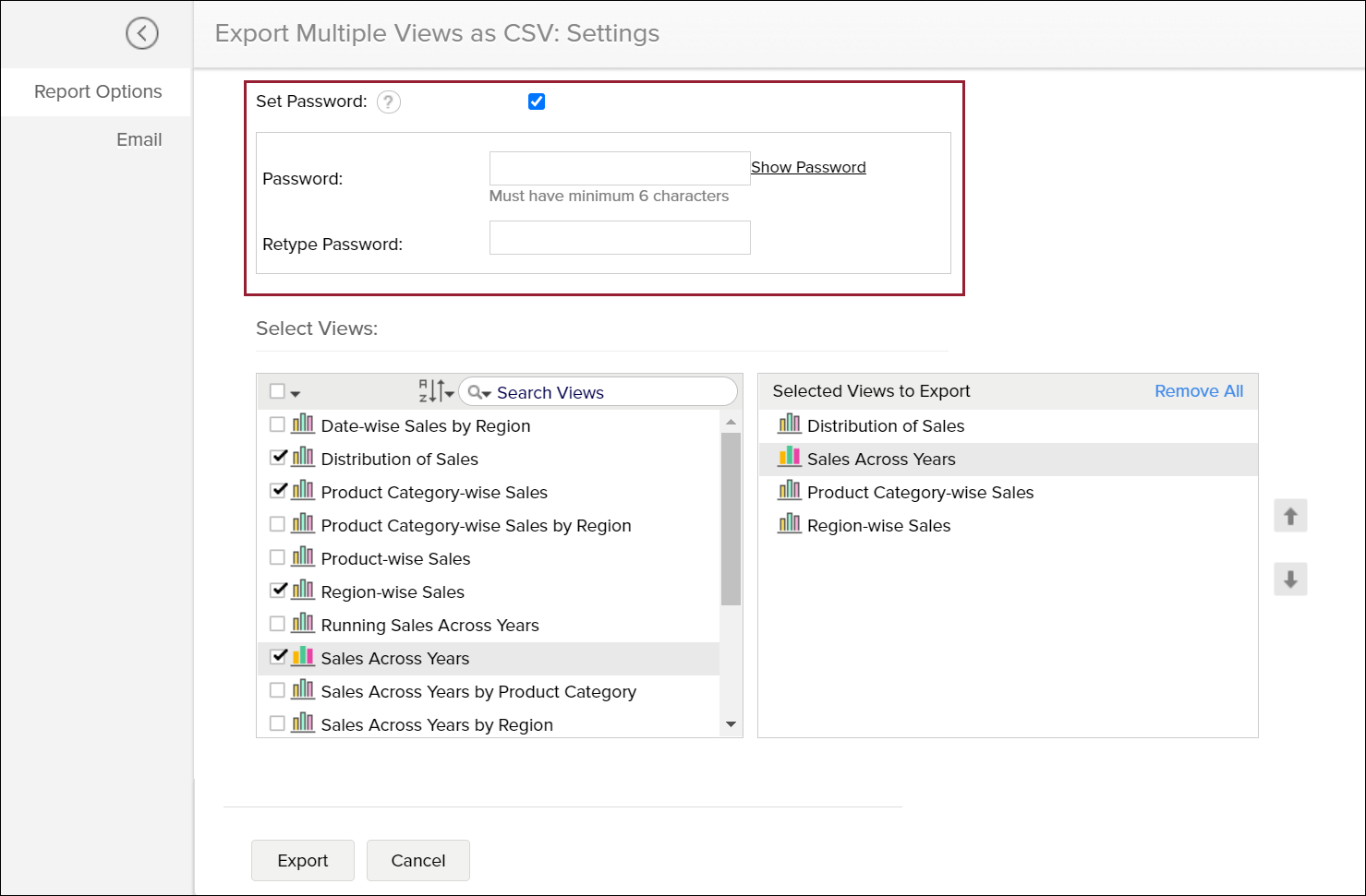 Yes, you can specify a password while exporting multiple views. To do this, select the Set Password option in the Export Settings page, and provide the required password.