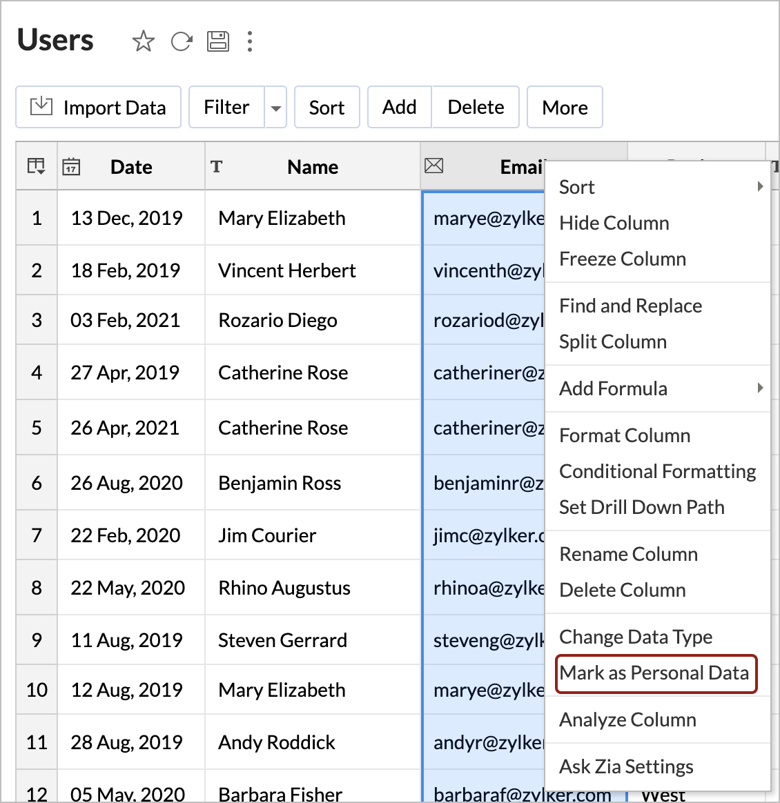 To secure the ePHI column, right-click the column and select Mark as Personal Data. The data will be encrypted and saved on our servers. While exporting views containing such data, the columns marked as personal data will not be included by default to avoid accidental sharing.