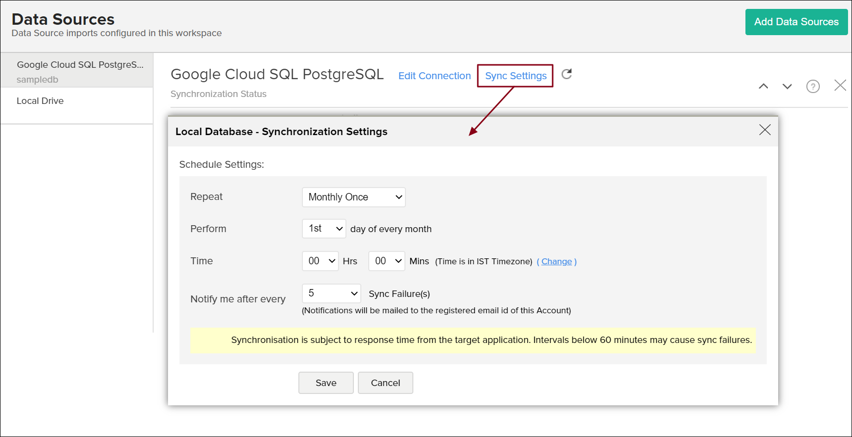 If you have created reports in Analytics Plus over columns or tables that don't have a direct mapping to the data in the database, mismatches will occur. These mismatches will be listed in the Cloud Database Connection Settings page, which can be accessed by clicking the Data Sources button from the side panel. Refer the following question to know more.