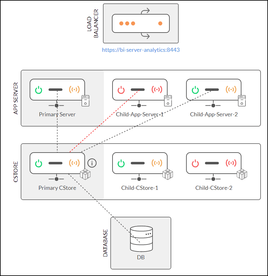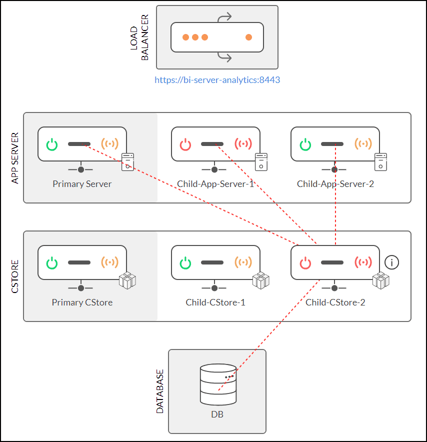 • Red: Indicates inactive connection between the App Server and CStore nodes as the App Server/CStore node is inactive.