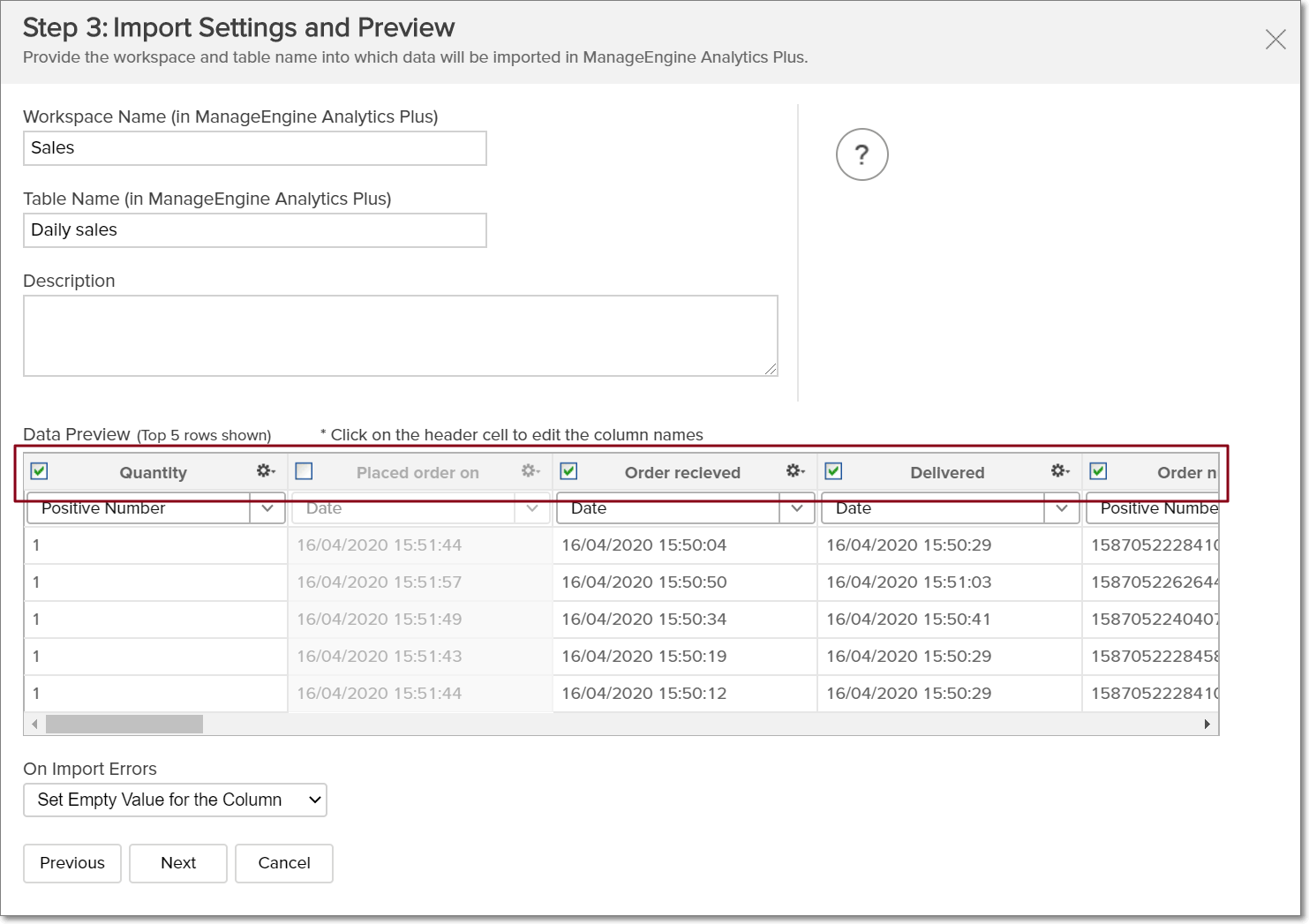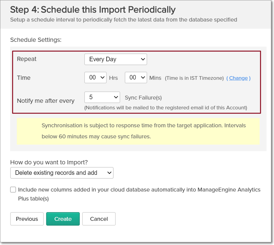 Note: In order to use the Add records at the end option, the source table should be modified in a way that it only displays new rows of data that have been added since the previous synchronization. Please contact analyticsplus-support@manageengine.com to use this option effectively.