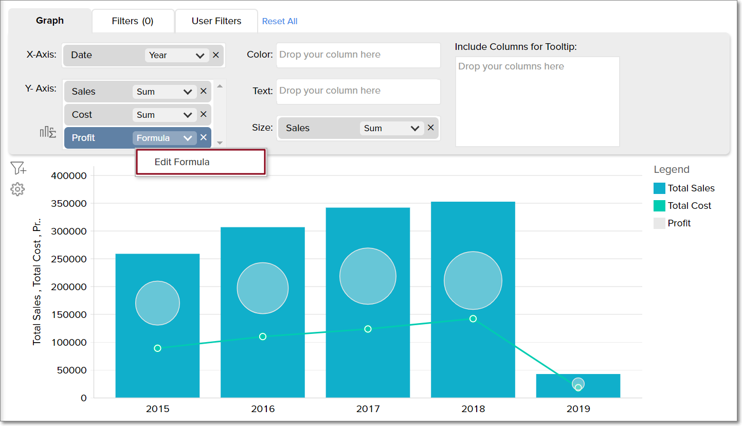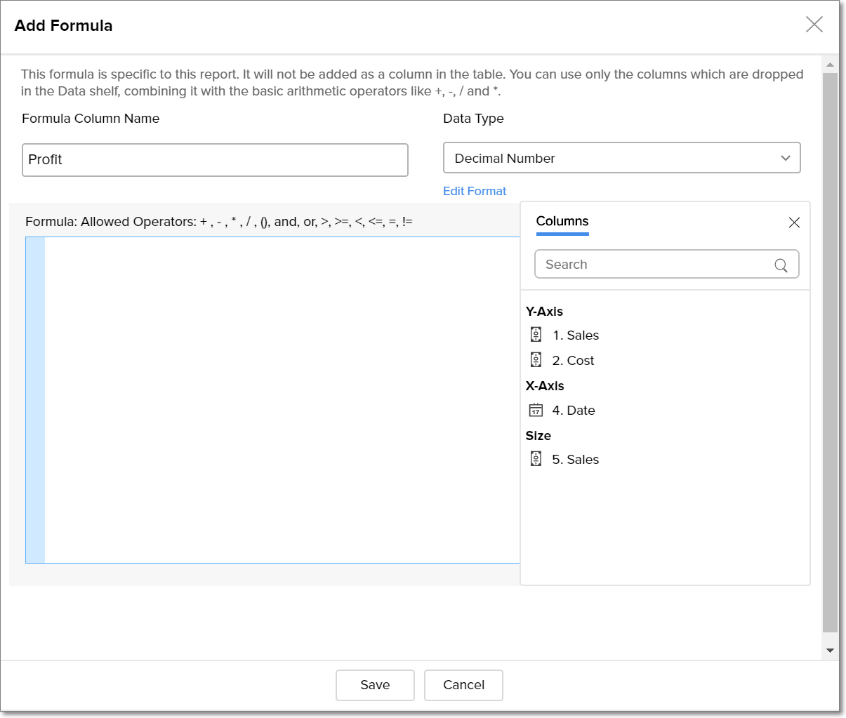 Report formula is a form of calculated metric that is specific to a particular report. While Formula columns and Aggregate Formulas are applied and associated to a data table, report formulas are applicable to only the report they are created over. Using this option, you can perform basic operations on the columns dropped in the Y-axis shelf for chart views, and in the Data shelf for pivot and summary views.