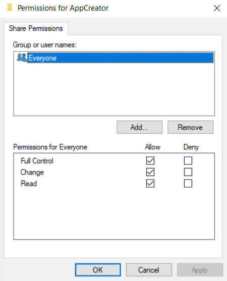 - Select Everyone and provide the Full Control permission and click OK.