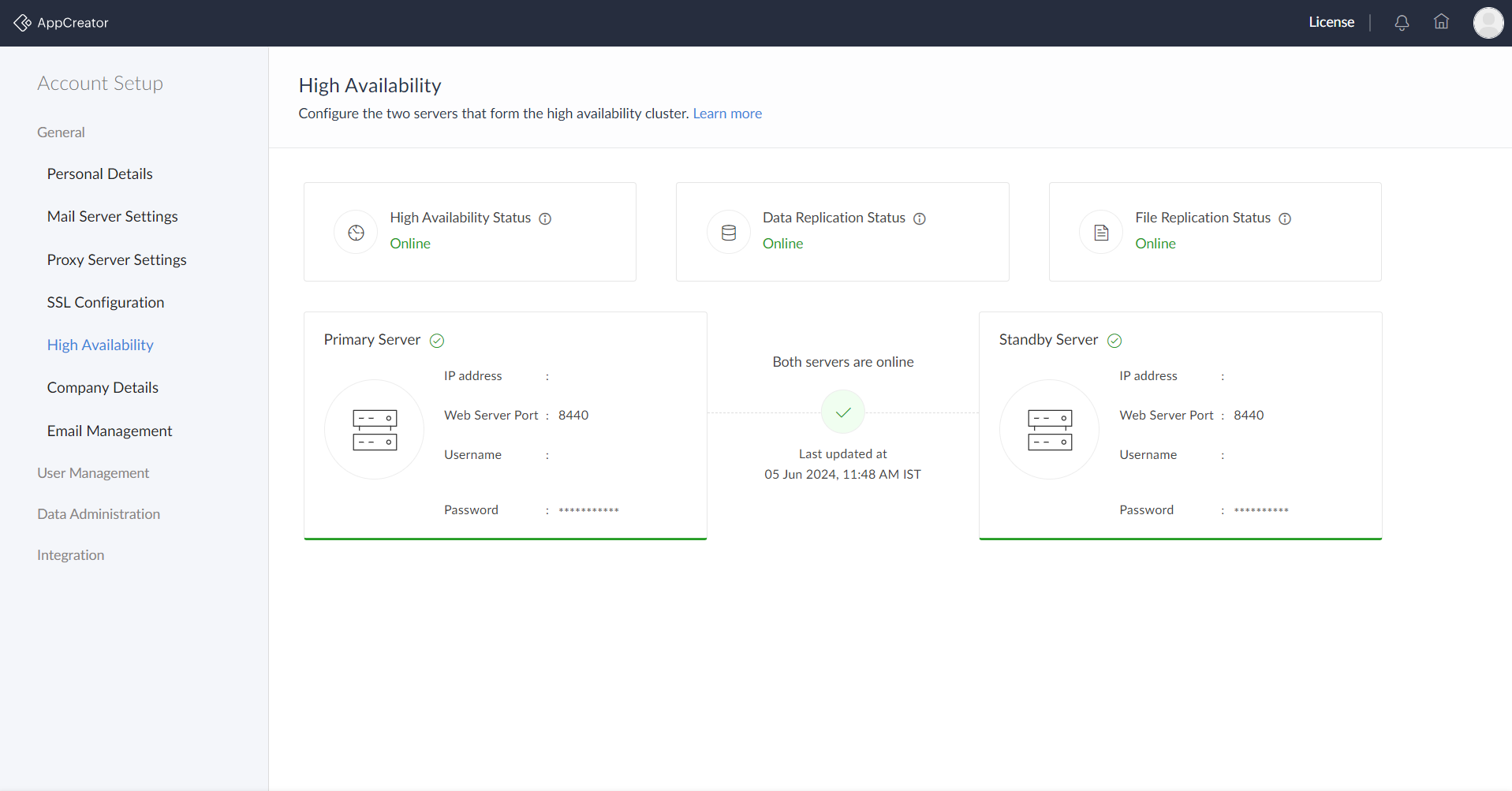 In AppCreator, you can configure high availability in a peer mode to ensure business continuity in the event of application downtime. To configure high availability, two servers must be configured—one as the primary server and the other as standby server. Replication of data between primary and standby will take place periodically after configuring a high availability cluster.