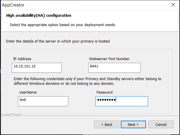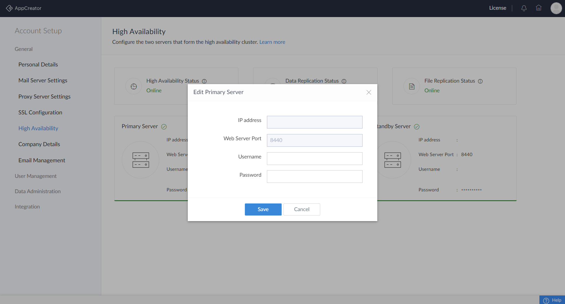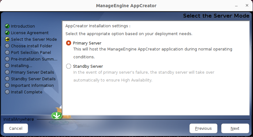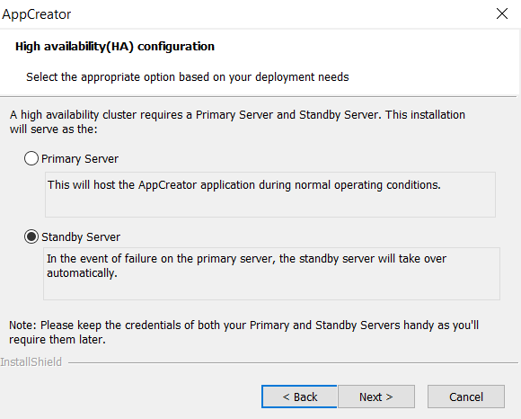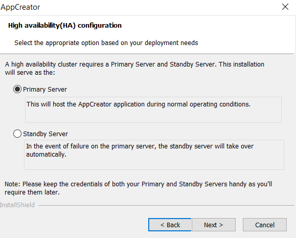 You can configure high availability while installing the AppCreator application. You will need two servers, one to be configured as the primary server, and the other to be installed as the standby server.