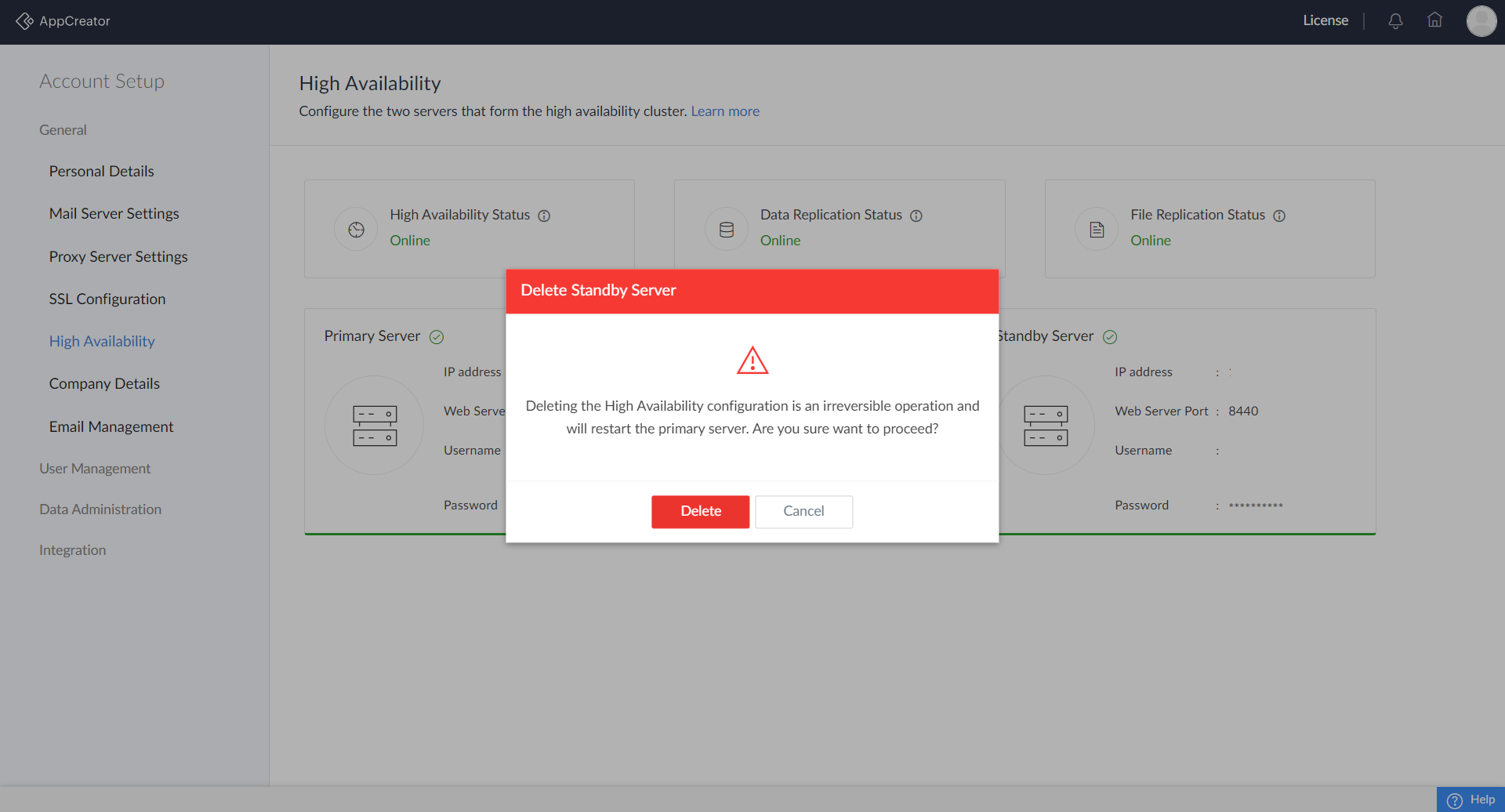 - Click the three dots menu over the primary server details, then the Edit icon that appears over the standby server's details, and click Delete. Confirm your action in the popup that appear to delete the high availability configuration.