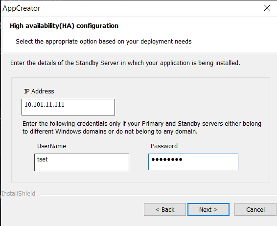 - Enter the static IP address of the standby server. It is not necessary to provide the remaining credentials if the Primary and Standby servers belong to the same Windows domain. Click Next to continue installation.