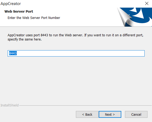 - Specify the web server port number where you want AppCreator to run. Click Next to continue.