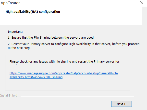 - To maintain synchronized data between your primary and standby servers, it is better to set up file sharing. Go to your primary server and follow the steps that are listed below to configure file sharing. Upon successfully configuring file sharing, restart the AppCreator application on the primary server with admin privileges. Click Next to continue.