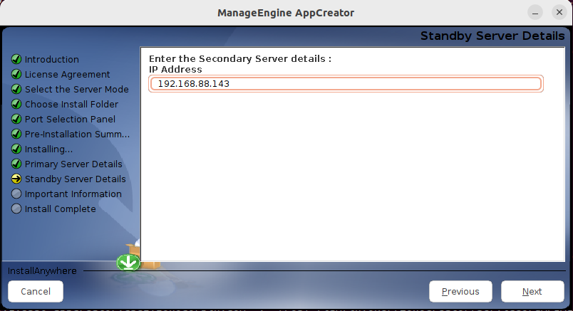 - Enter the standby server's IP address and click Next to proceed with the installation process.