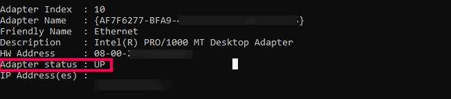 - Locate the NIC card whose Adapter Status is displayed as UP. Copy and paste the Adapter Name in a separate file. This will be the NIC address of the corresponding server.