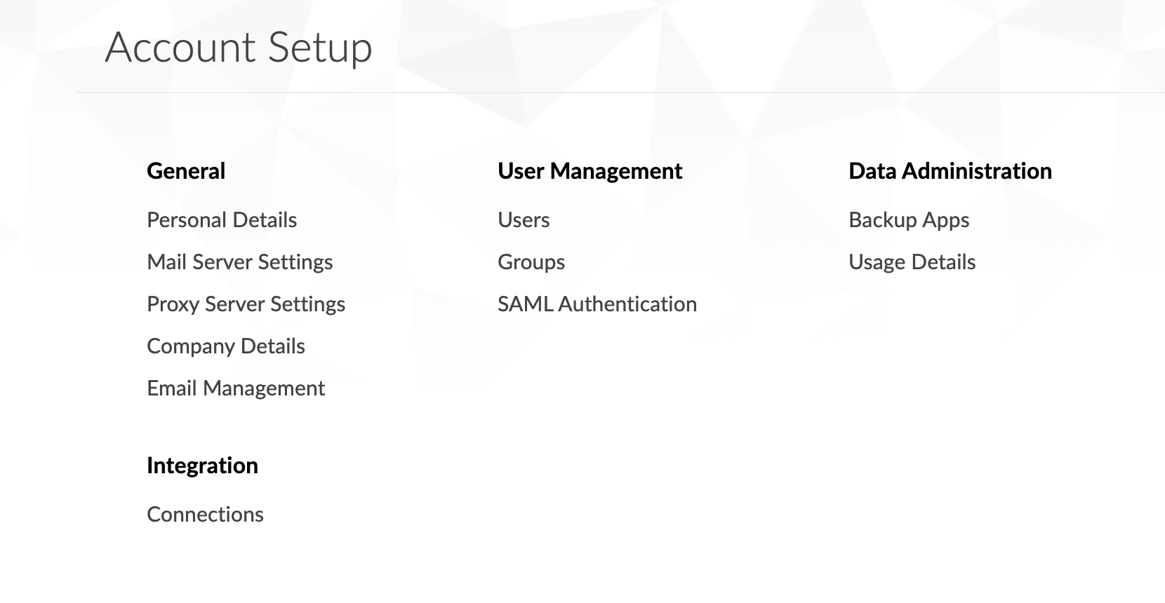 | Data administration | Backup Apps: Take a backup of your application and restore it whenever required. Usage details: View the usage count of different elements in your account. |