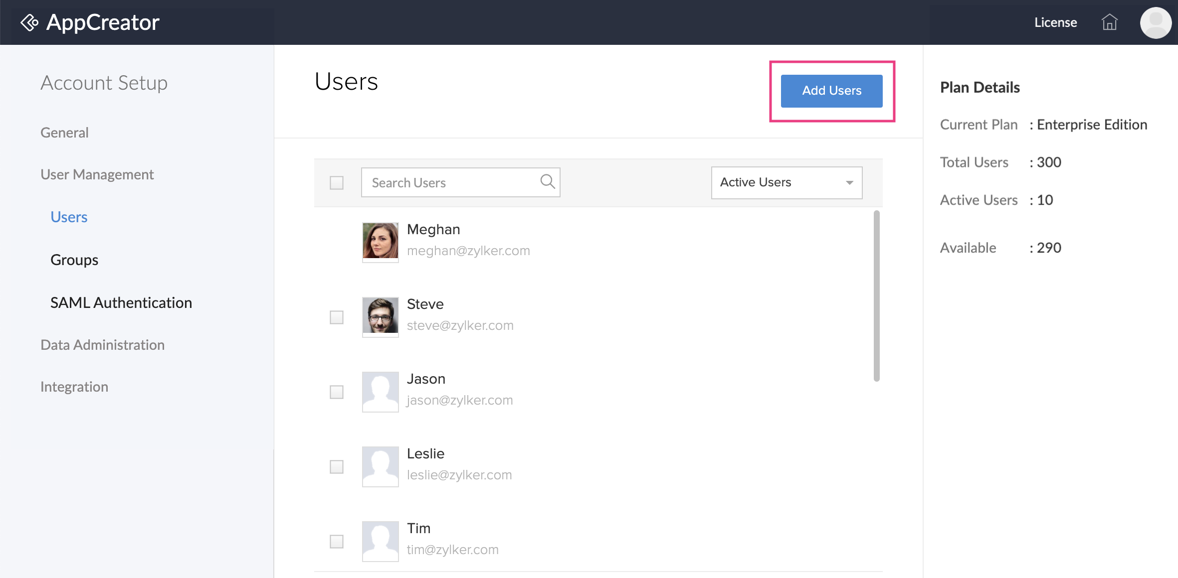 You can add users to your account by specifying their email addresses. The number of users you can add to your account depends on your subscription plan.