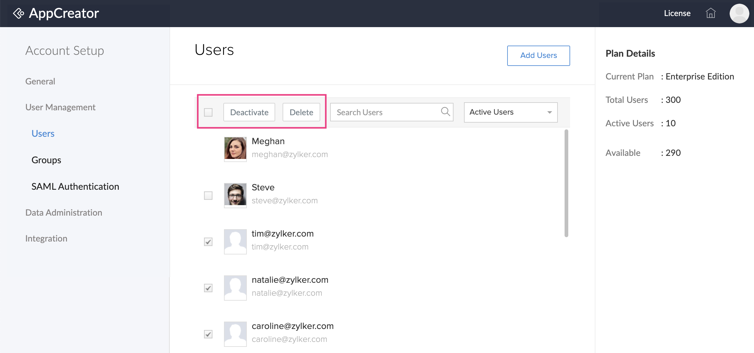 By default, a user's status will be Active. You can share your application only with users whose status is Active. To deactivate a user,