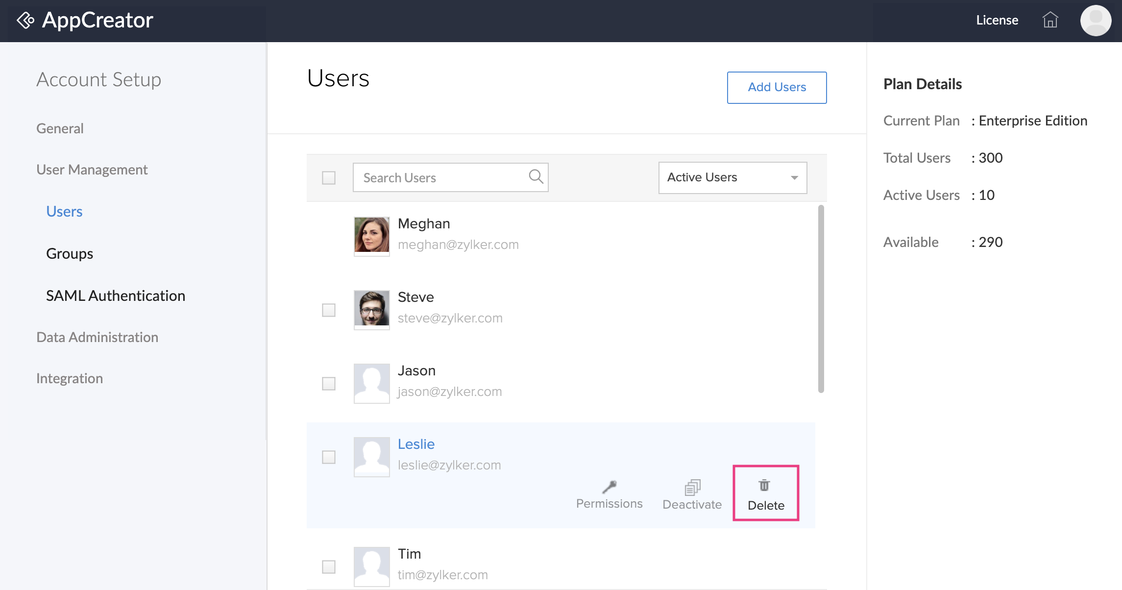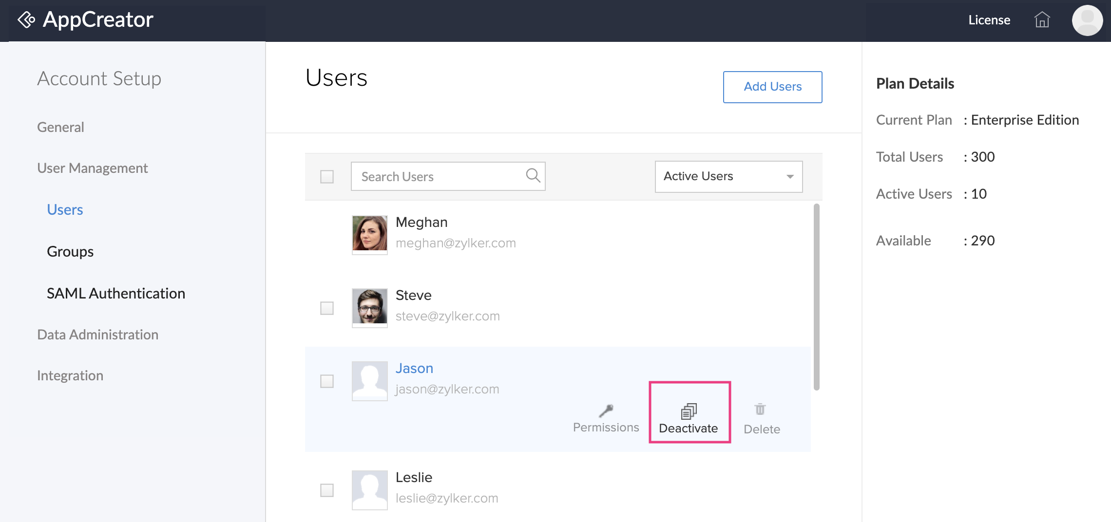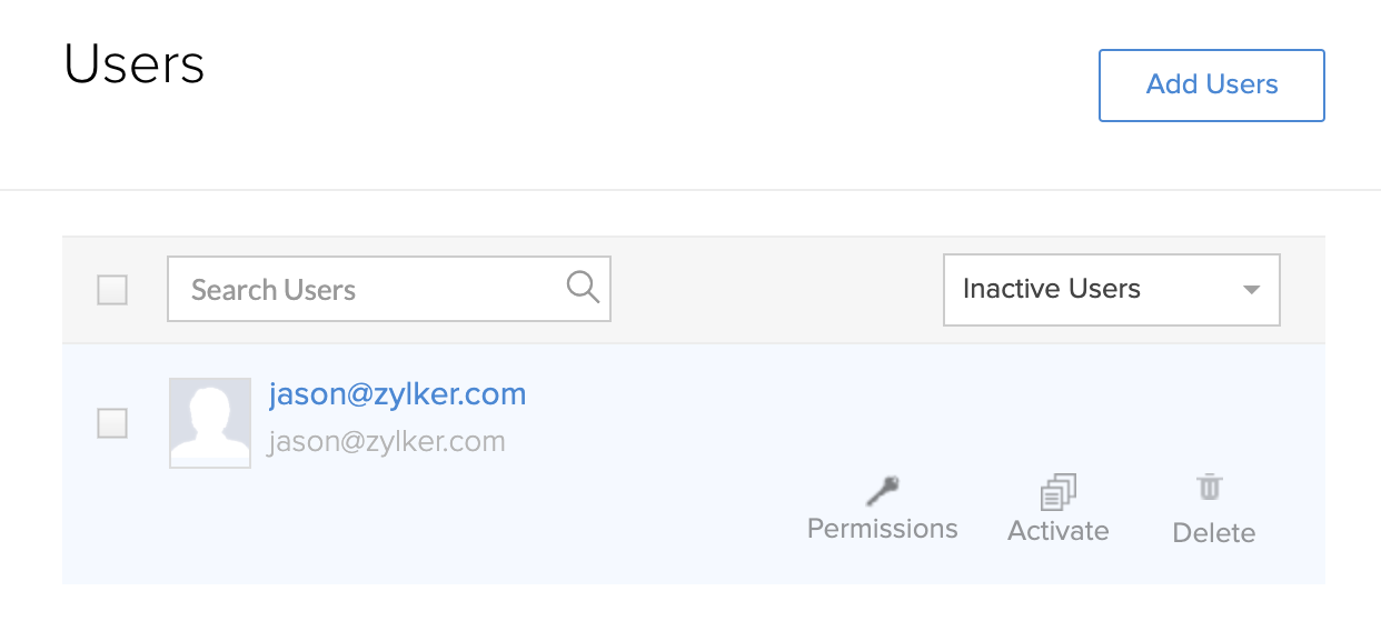- The Users tab displays the added users. You can set permissions, deactivate, or delete the user anytime from your account.