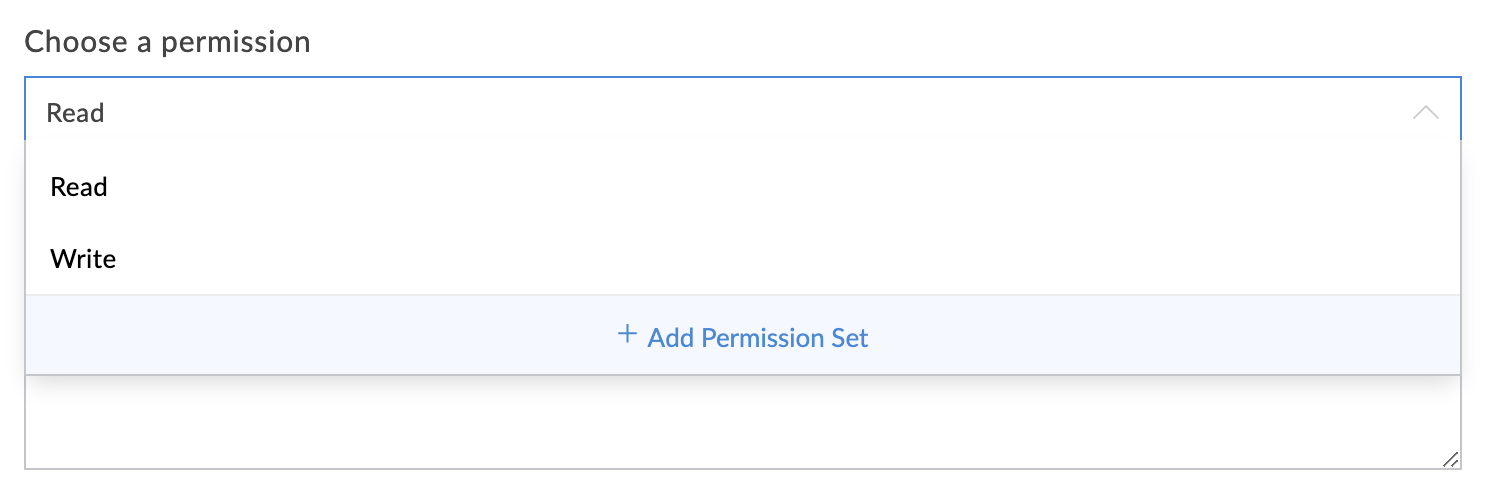 - The users can be assigned three different permissions: Read, Write, and Custom. To configure a custom permission set, click + Add Permission Set.