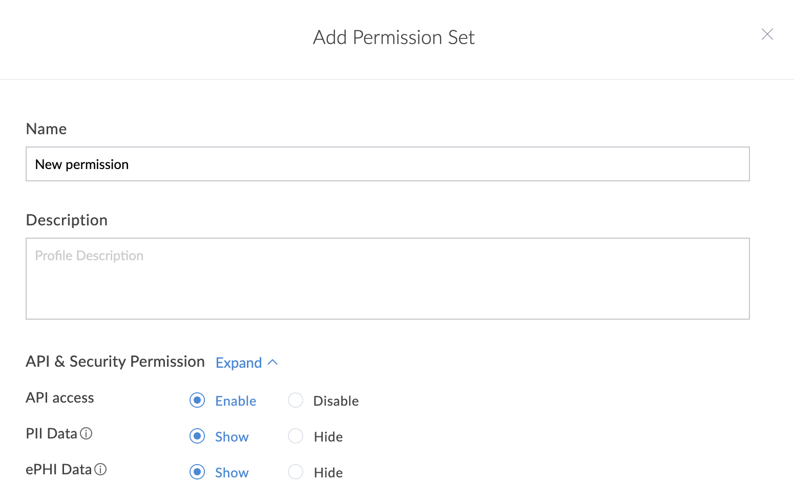 - In the Add Permission Set tab, specify a name and description for the new permission set. You can also set API & Security permissions by enabling or disabling the API access, PII Data and ePHI Data.